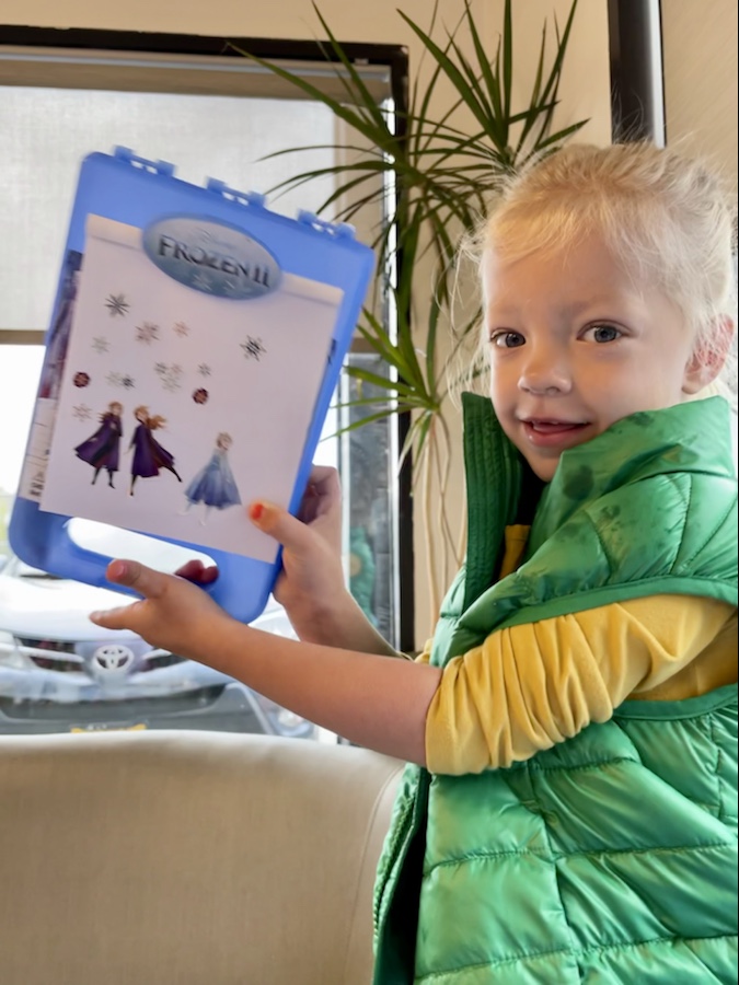 Reagan begins her major coloring kick. Whoever created mess-free coloring markers; you deserve a medal. Harper and Emerie both have marker stained faces from running out of sight with the Crayola marker set and you can tell! Reagan loves her sparkly, Frozen themed mess-free coloring and sits for a few minutes each hour and colors another one, mostly in the lines, to proudly display on the fridge.
