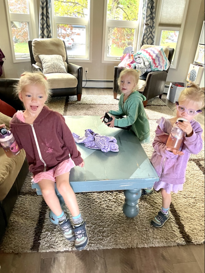 This is the second time a positive case was announced in the girls’ classroom since school started in August, without any specifics times or details, as to keep the other kids anonymous (silly if you ask me!). We assume this is where it was transmitted and we had a very short window to get in the right headspace of spending ten days stuck at home with three rambunctious toddlers, who may be sick but clearly felt fine overall. Over the next few days, they definitely felt better than their parents as the infection slowly crept into our sinuses. Catching all sicknesses is part of being a parent…right? Or is it just part of being a mom? I can’t remember.