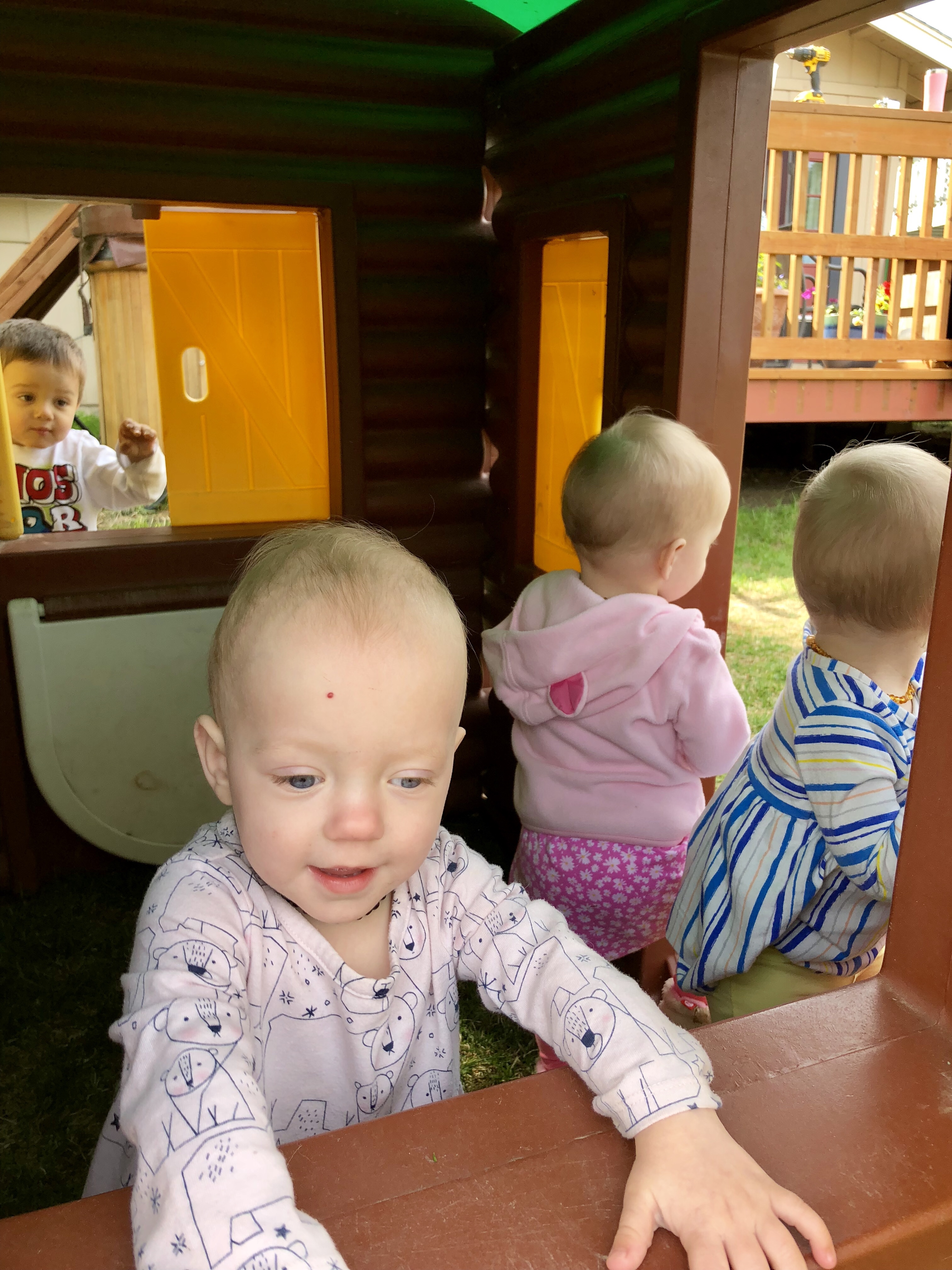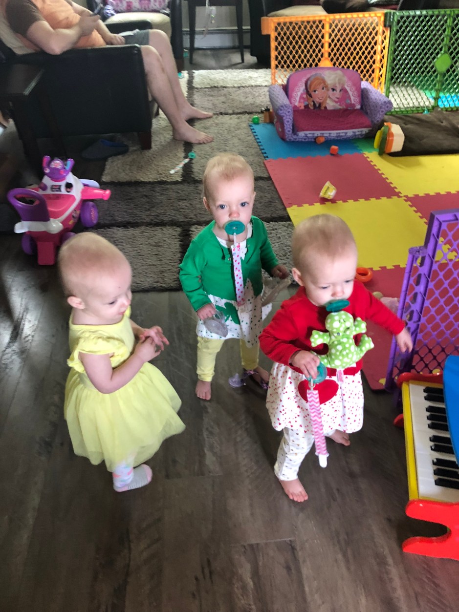 Reagan remains the shyest of the three and is the binkie baby. Not only does she constantly yell “binkie” at you, but she often has one in each hand and one in her mouth. Her love of binkies reaches to her sisters and she is more than willing to share one when a sister is upset. Little does she know this phase of her life is nearing an end, when the binkies will be out of sight and hopefully out of mind… that might be a rough week. She is a daredevil in some ways, but also willing to hang back and see what Harper and Emerie do first.