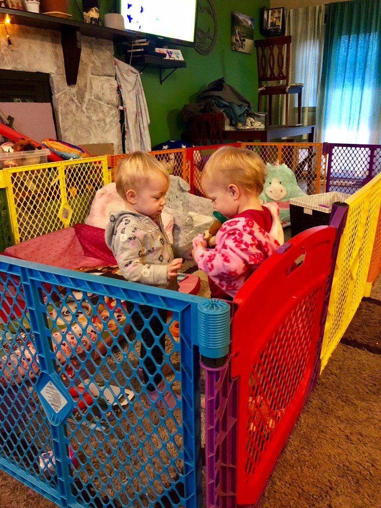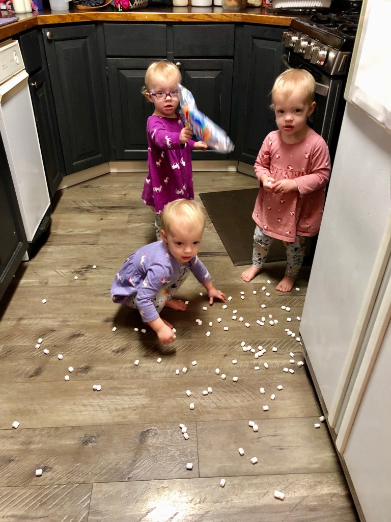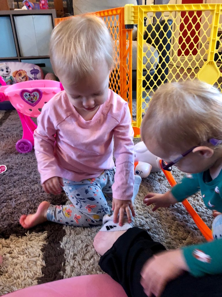 In the midst of that, small tasks allow the girls to be more helpful. Everyone throws their laundry downstairs at bedtime, sometimes help clean up toys, and will put their boots and coats away when asked. If directed, they will bring a toy or juice over to their sister as well as a binkie for comfort.