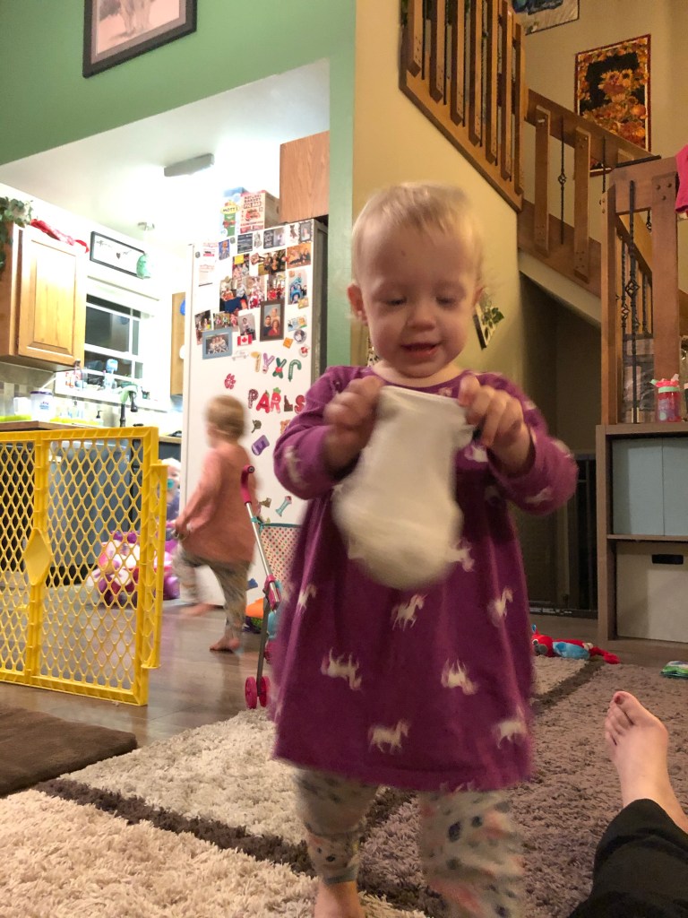 While cleaning up toys is not a constant practice with her, she does love to run around the room with the toy vacuums and pretend to clean the floor and rugs. I think she will be the kid to vacuum the house once she’s bigger, as the real vacuum is quite intriguing. She greatly enjoys bath time and standing at the faucet and playing, but will run from you when you try to brush her hair afterwards. Luckily, with a small bribery of chocolate chips, she doesn’t fight getting her hair done.