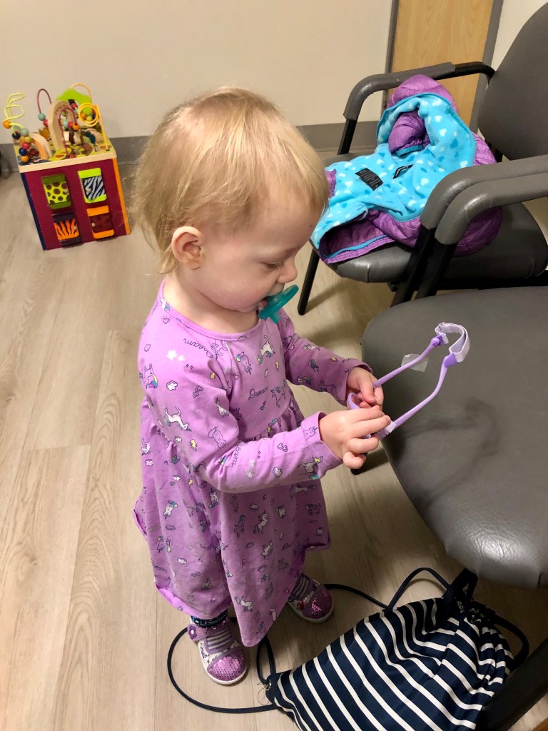 She doesn’t mind getting her hair done and getting “pretty.” She likes to check out Mom’s jewelry and will tell me it’s pretty with a big smile. Lastly, she is the only one of the three that actively helps clean up the house- she will put toys back into the bins and close them, even before any prompting from an adult.
