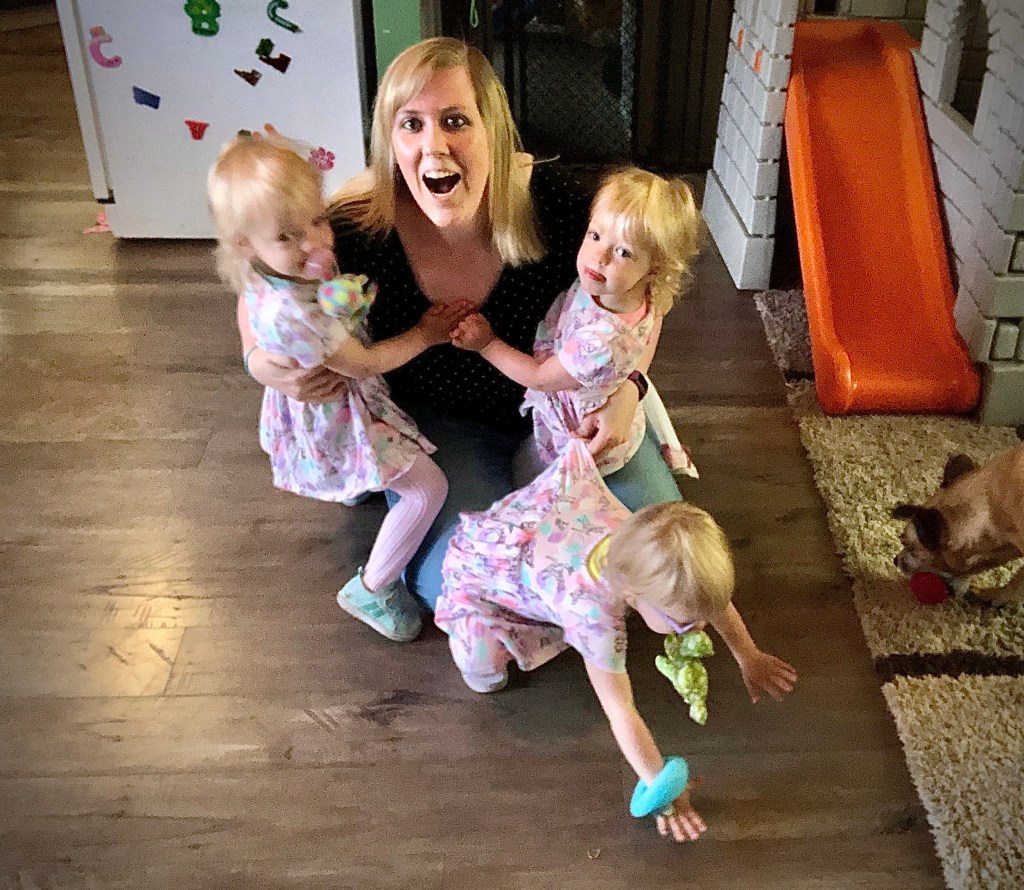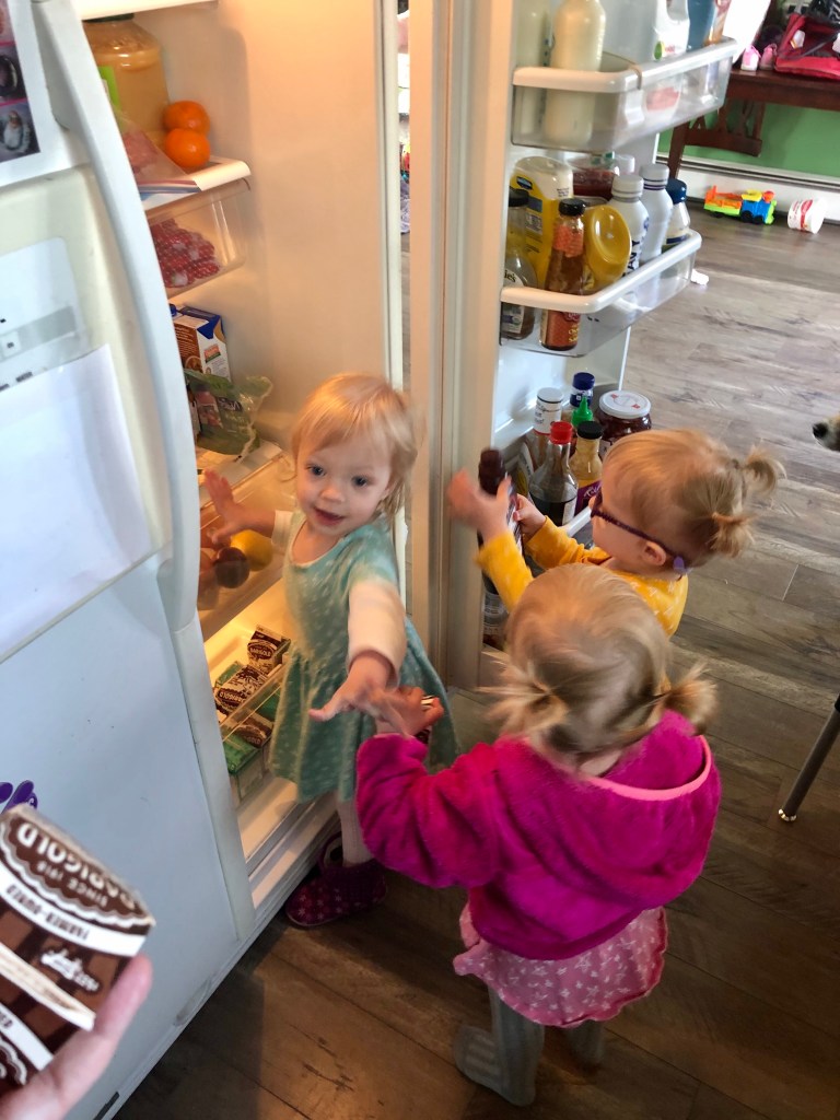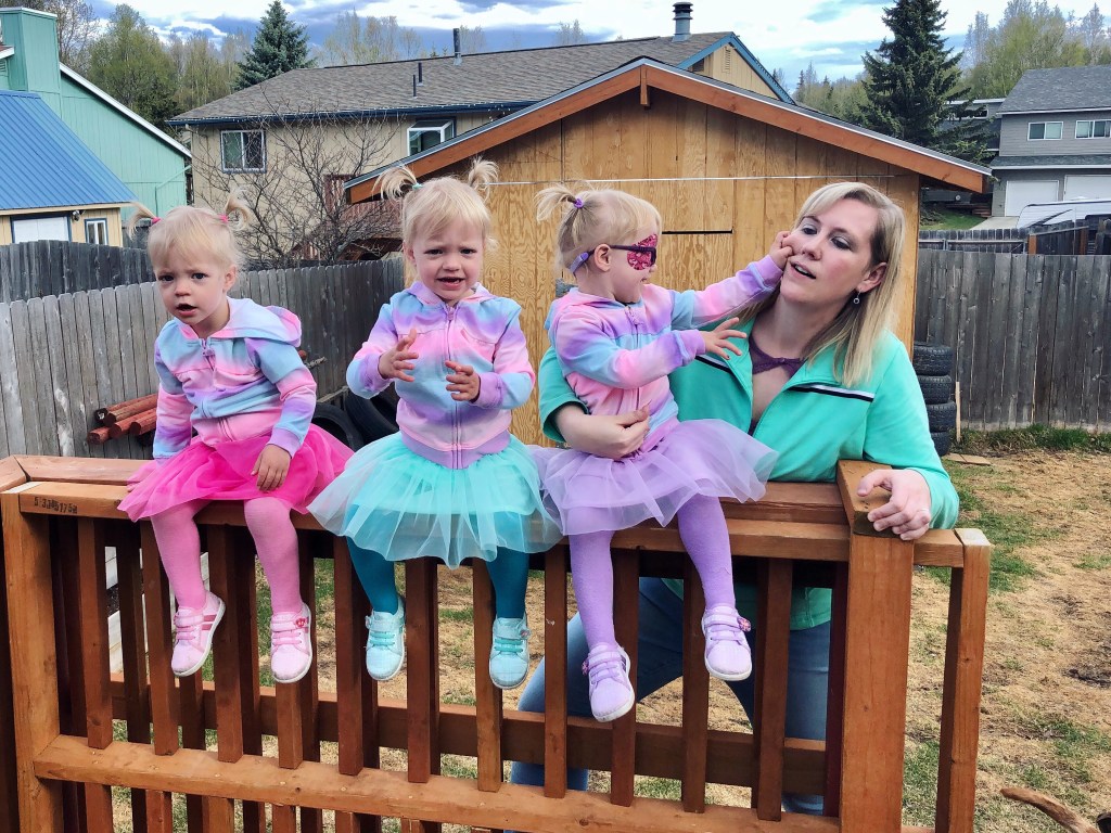 But not everything is different- of course there are also similarities to raising three of the same age at the same time. Everyone likes to sit in the middle car seat and fight over it, with Emerie the best behaved of the three during rides around town. Favored activities include the trampoline park, sledding, playgrounds, neighborhood walks, swinging (yes it needs its own category), baking, play dough, arts and crafts, anything with buckets and scoopers and pretend play. Everyone loves to play in the bathtub and make a huge mess on the bathroom floor. They all LOVE trash truck and snowplow visits, seeing forklifts at the store and helping hold things in a shopping cart. Moose sightings are a huge deal and worth talking about for days. Everyone loves their designated colors and fully believes they should never have to share something that is “their” color, including silverware and dishware, clothing and any type of toy/stuff animal that is pink/purple/teal. All three love to FaceTime with family and hold the phone themselves, hogging it as much as the parents will allow and running off with it to hide.