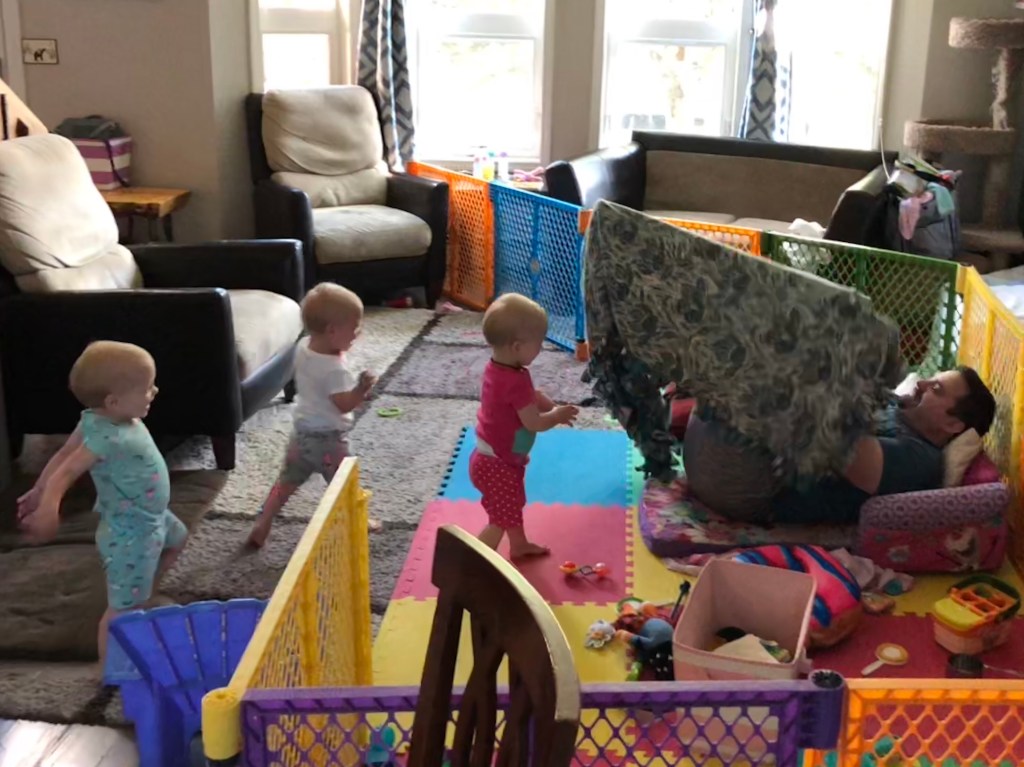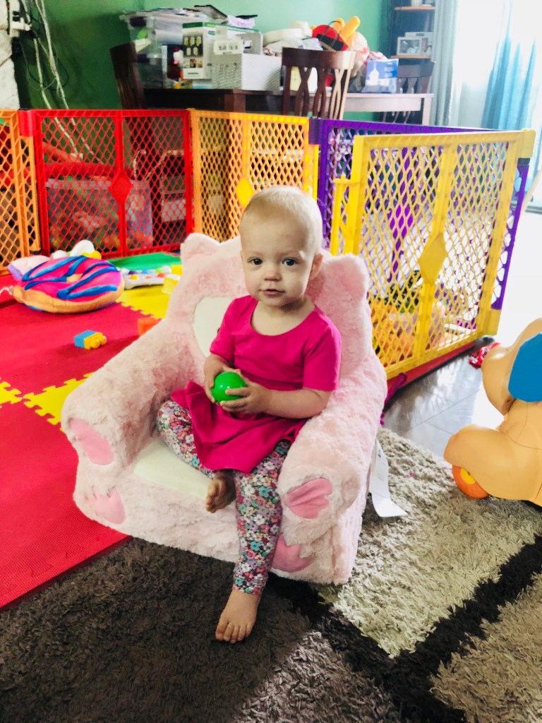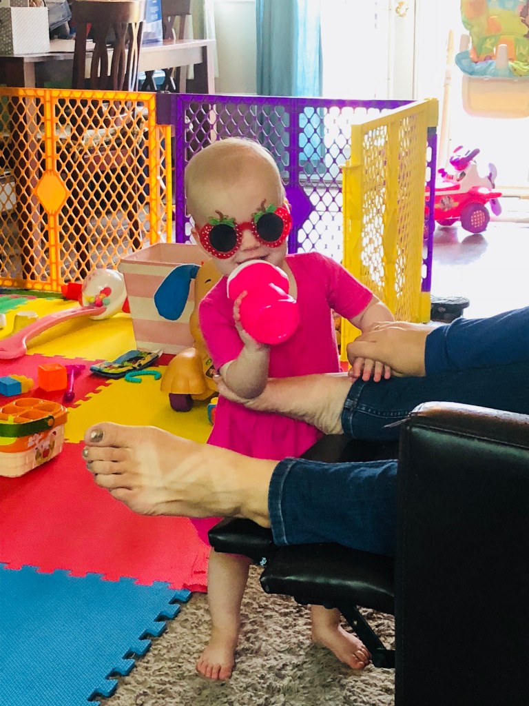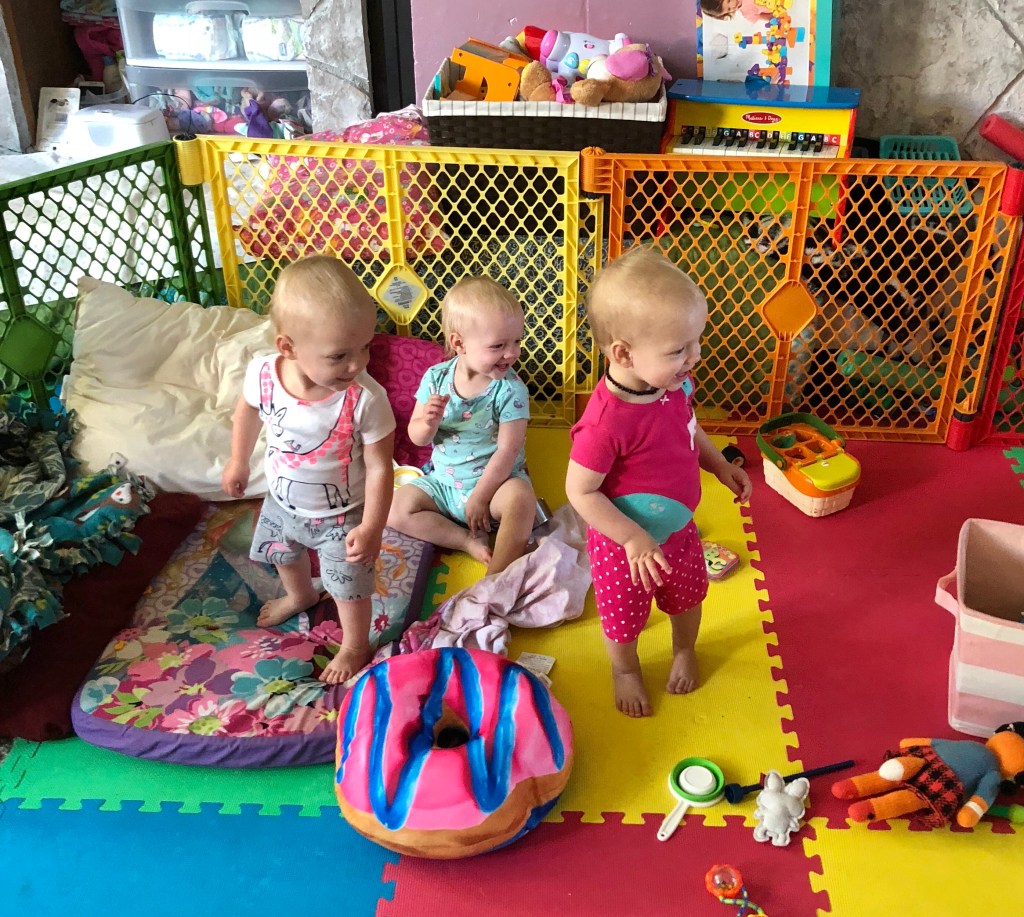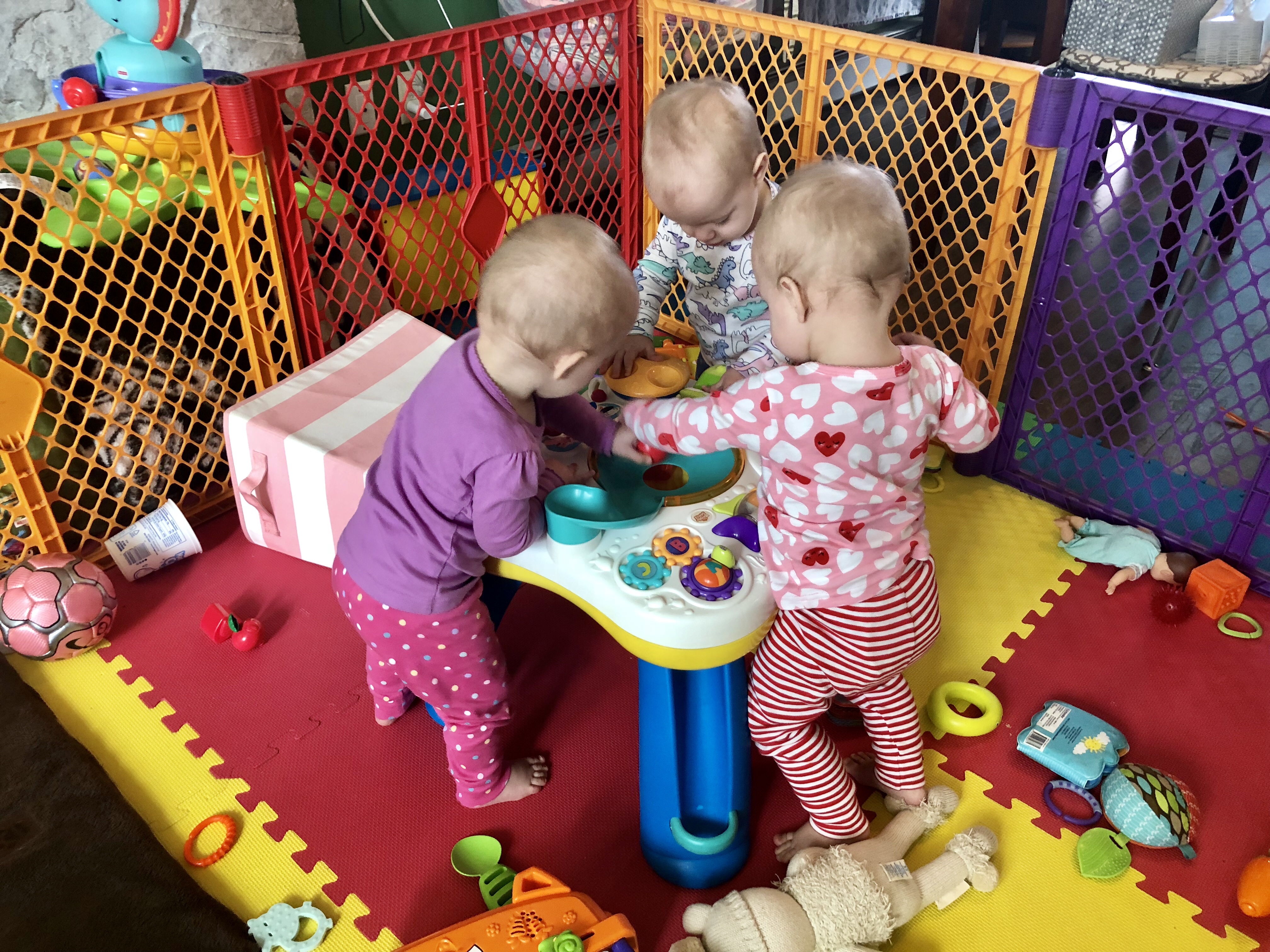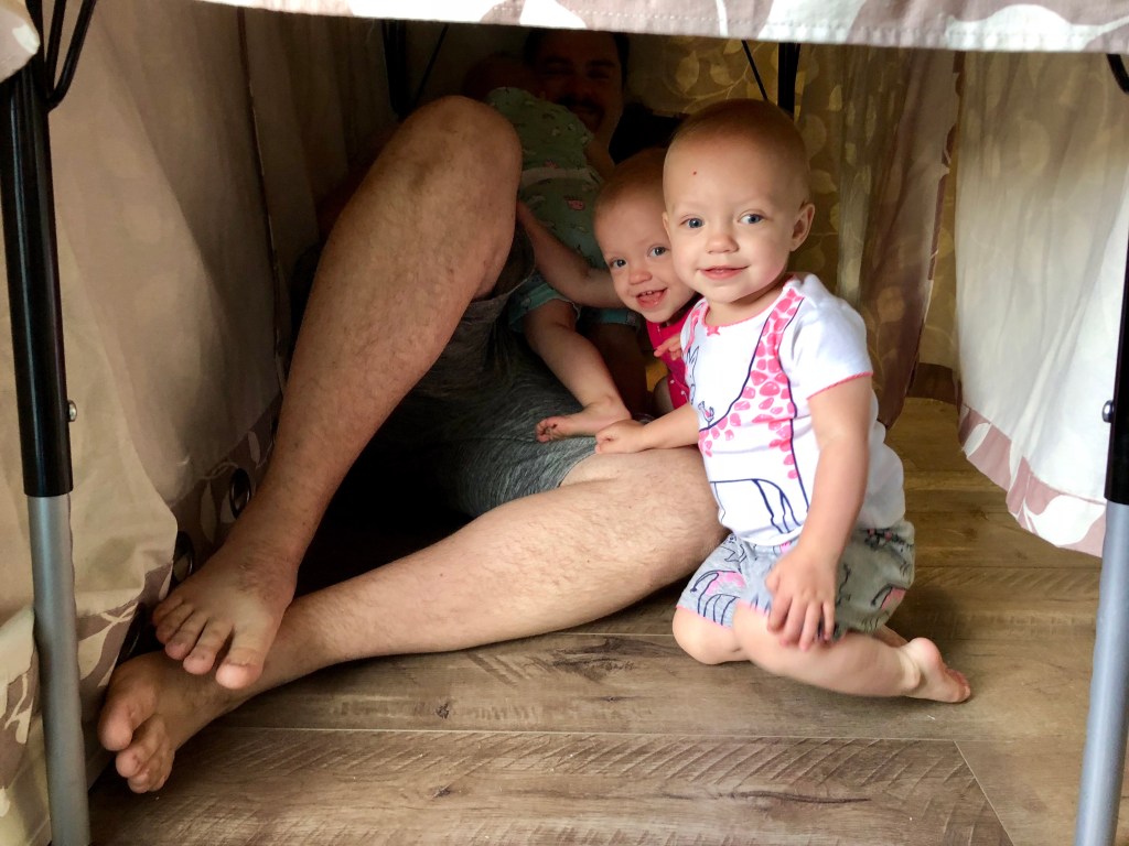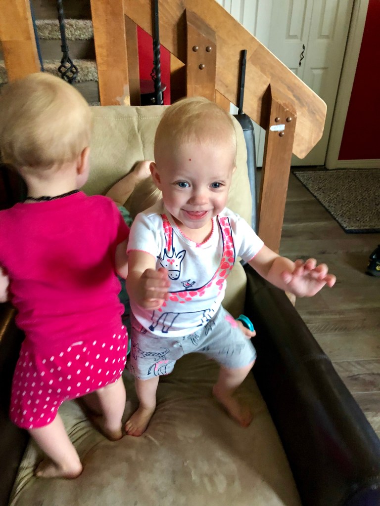 Other daily activities include climbing on anything available, running maniacally around the house, speed running while pushing their walkers (into each other or anything in front of them), pulling all food utensils and cookware out of kitchen cabinets, and playing out on the back porch. Cardboard boxes are also popular; who needs toys when you can play with the Amazon box, or the macaroni and cheese box, or the huge goldfish box from Costco?! The girls also push each other on toys now, whether it is with one sitting on the lawn mower and one pushing or one sitting in the mini airplane and two pushing. It brings many giggles and hasn’t resulted in too many crashes so far. We’ve also started building blanket forts. That is a hit literally, as they run full blast at the fort only to hit their forehead on the table under the blanket. We are still working on that…
