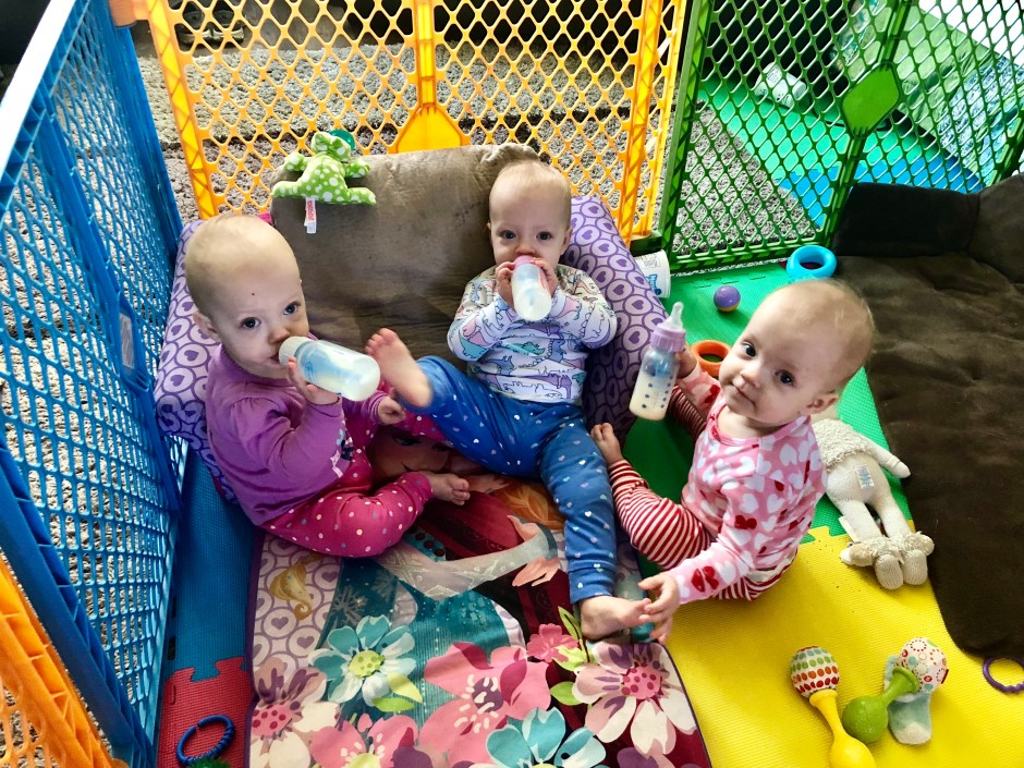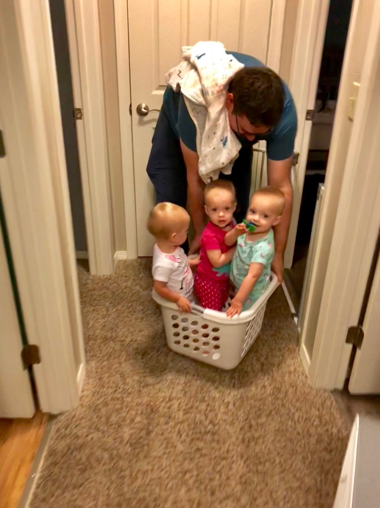 In case anyone was wondering, because it has been a while…yes, Craig can still carry all three at once, although he doesn’t test this out too often. For some reason they are starting to get heavier! Instead of immediate baby rage like prior months (insert the “stop touching me” kid voice), they all think it is just so funny! Nothing like carrying 65 pounds of wiggly baby at once and not letting anyone leap off, fall, or collide. Enjoyment ensued in the triple baby bedtime laundry basket ride, as Craig dragged them down the hallway in the midst of many goofy giggles. With the growth since December’s earthquake, I’m not entirely sure I could load everyone into a laundry basket and carry them to safety during an earthquake; they are much bigger now!