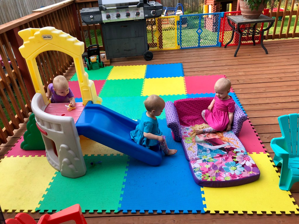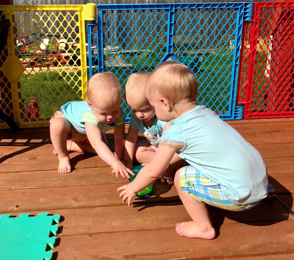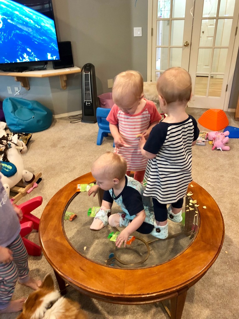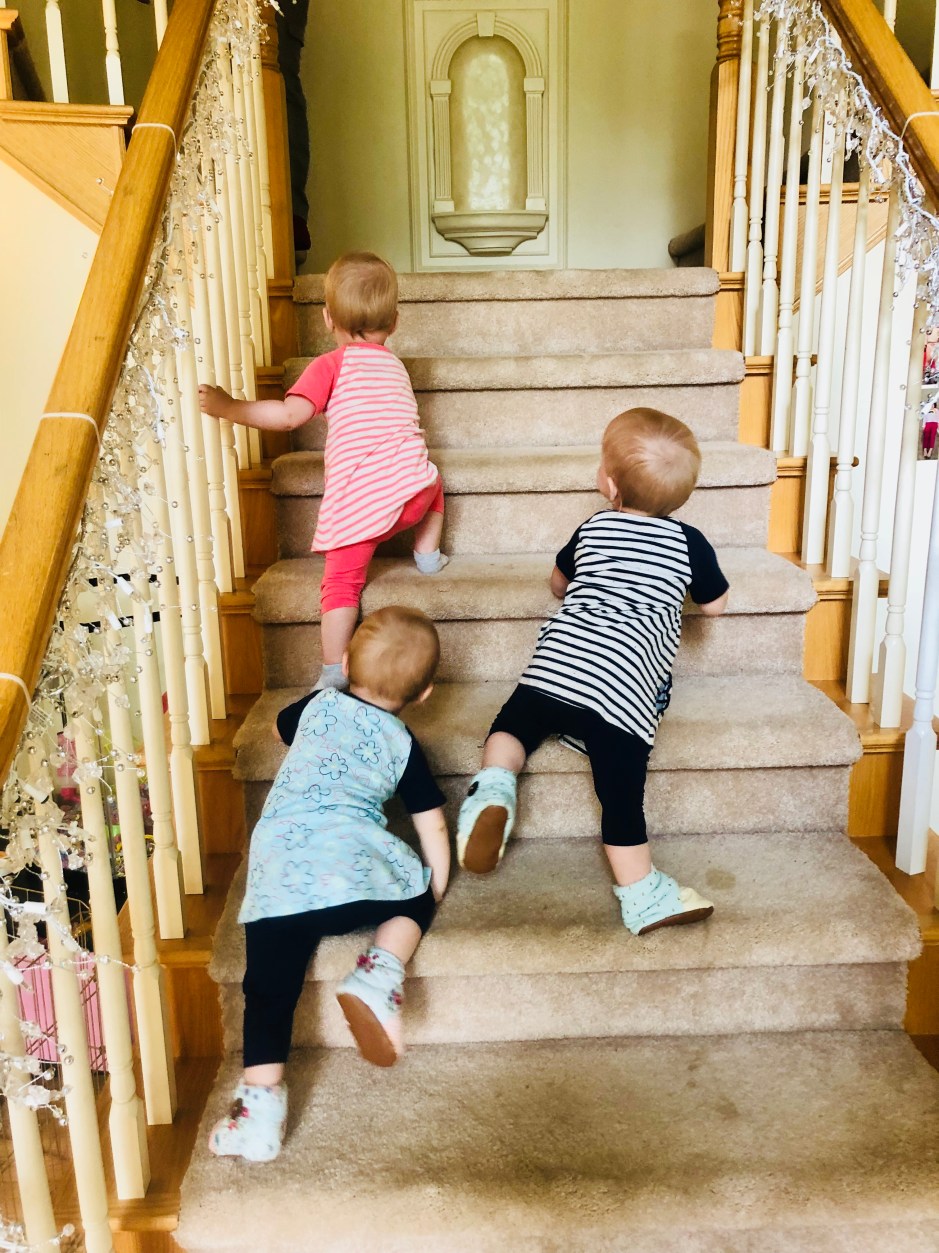 They all have different methods to climbing down stairs and all do it surprisingly well when they aren’t distracted by all the cool railings, or the dog, or the thought of running back upstairs. Harper tries to go down like an adult, on her feet, without holding on! She’s given me several mild heart attacks, but luckily an adult is always close by to catch her. Emerie scoots on her butt now and I’ve seen Reagan try both ways. We are working on railing safety and so far no one has fallen forward, even with the dogs “helping”. While the stair baby gates are not leaving anytime soon, it is good to know that they are starting to understand how to safely climb down. This is especially the case when the dog door is accidentally left open and Miss Harper goes through it like a heat seeking missile, running straight for the three unblocked deck stairs…