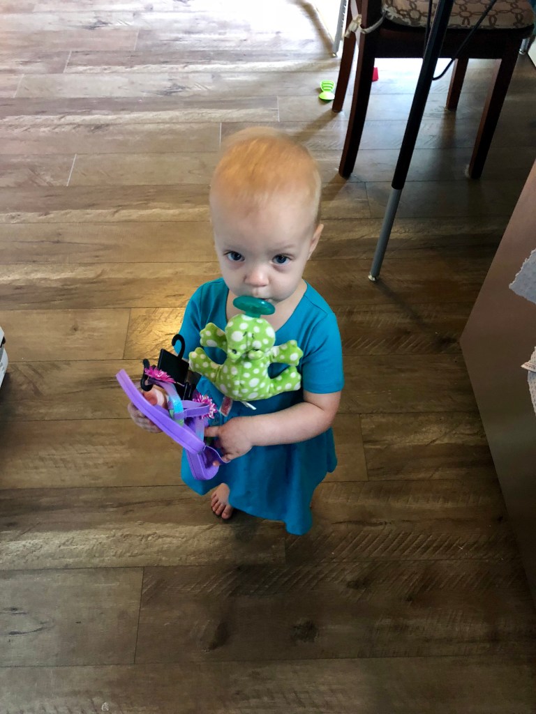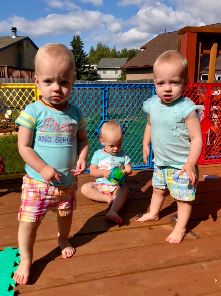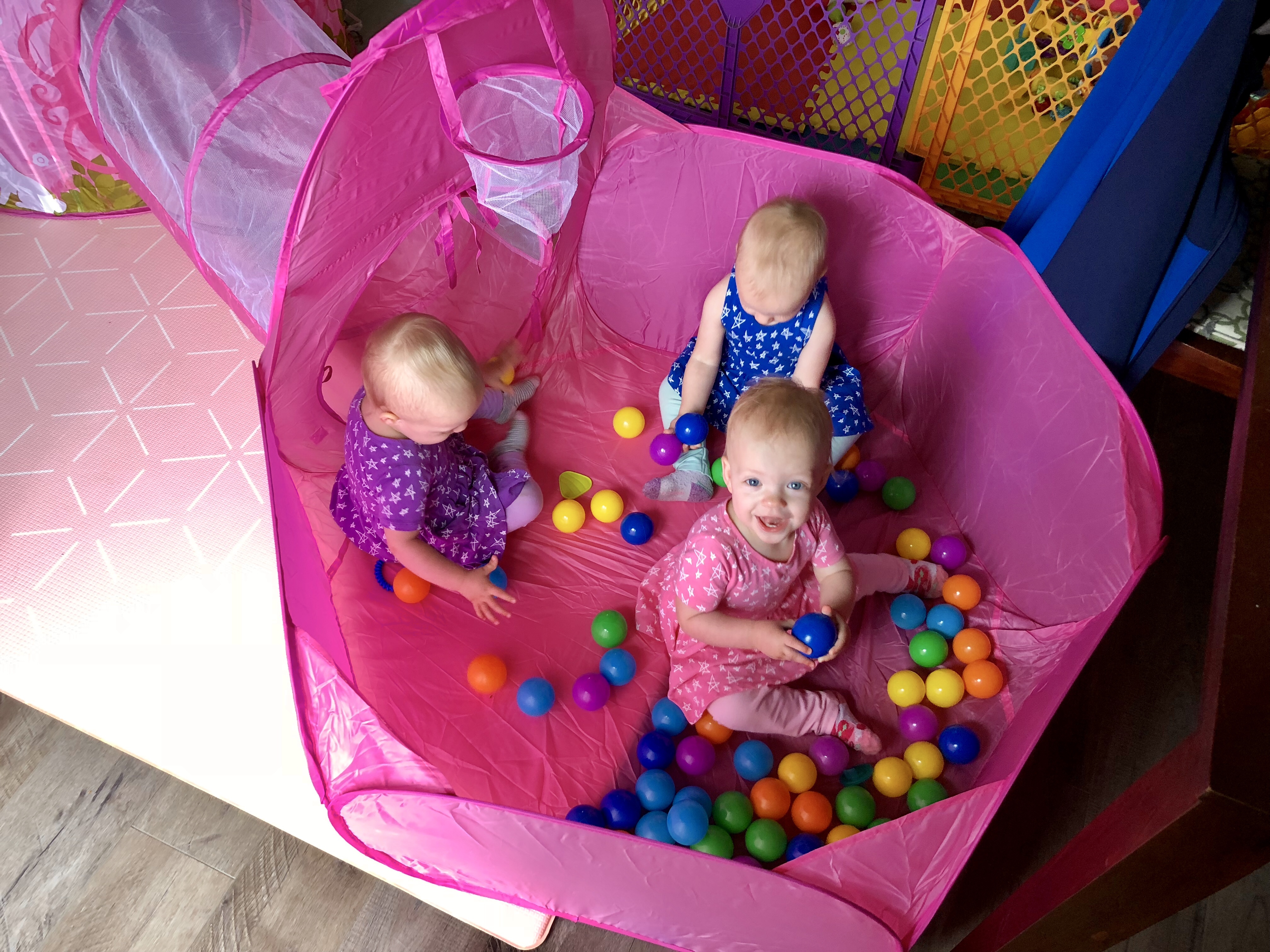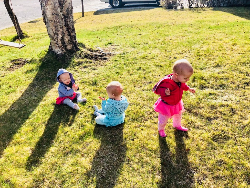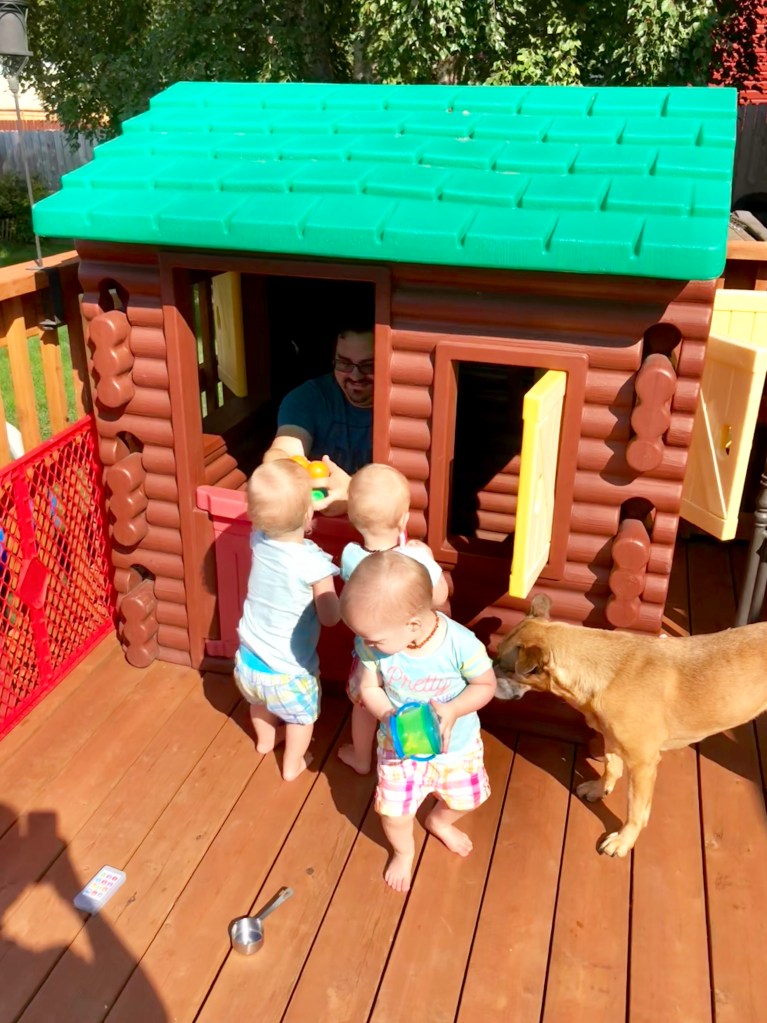 They all have different methods to climbing down stairs and all do it surprisingly well when they aren’t distracted by all the cool railings, or the dog, or the thought of running back upstairs. Harper tries to go down like an adult, on her feet, without holding on! She’s given me several mild heart attacks, but luckily an adult is always close by to catch her. Emerie scoots on her butt now and I’ve seen Reagan try both ways. We are working on railing safety and so far no one has fallen forward, even with the dogs “helping”. While the stair baby gates are not leaving anytime soon, it is good to know that they are starting to understand how to safely climb down. This is especially the case when the dog door is accidentally left open and Miss Harper goes through it like a heat seeking missile, running straight for the three unblocked deck stairs…