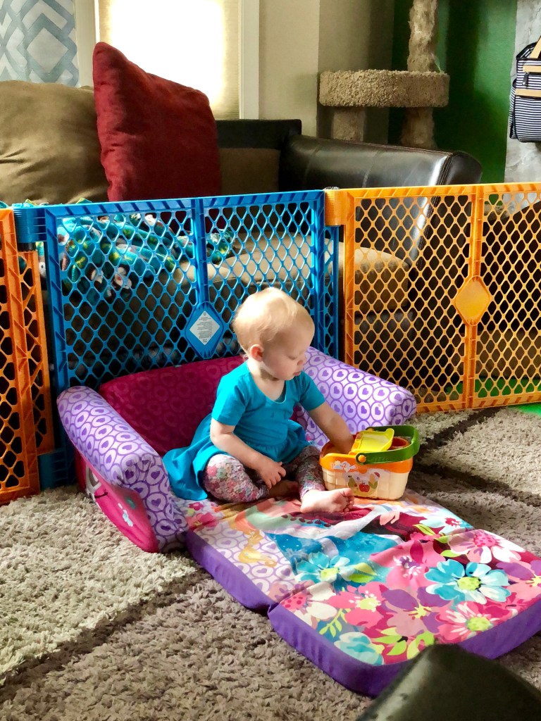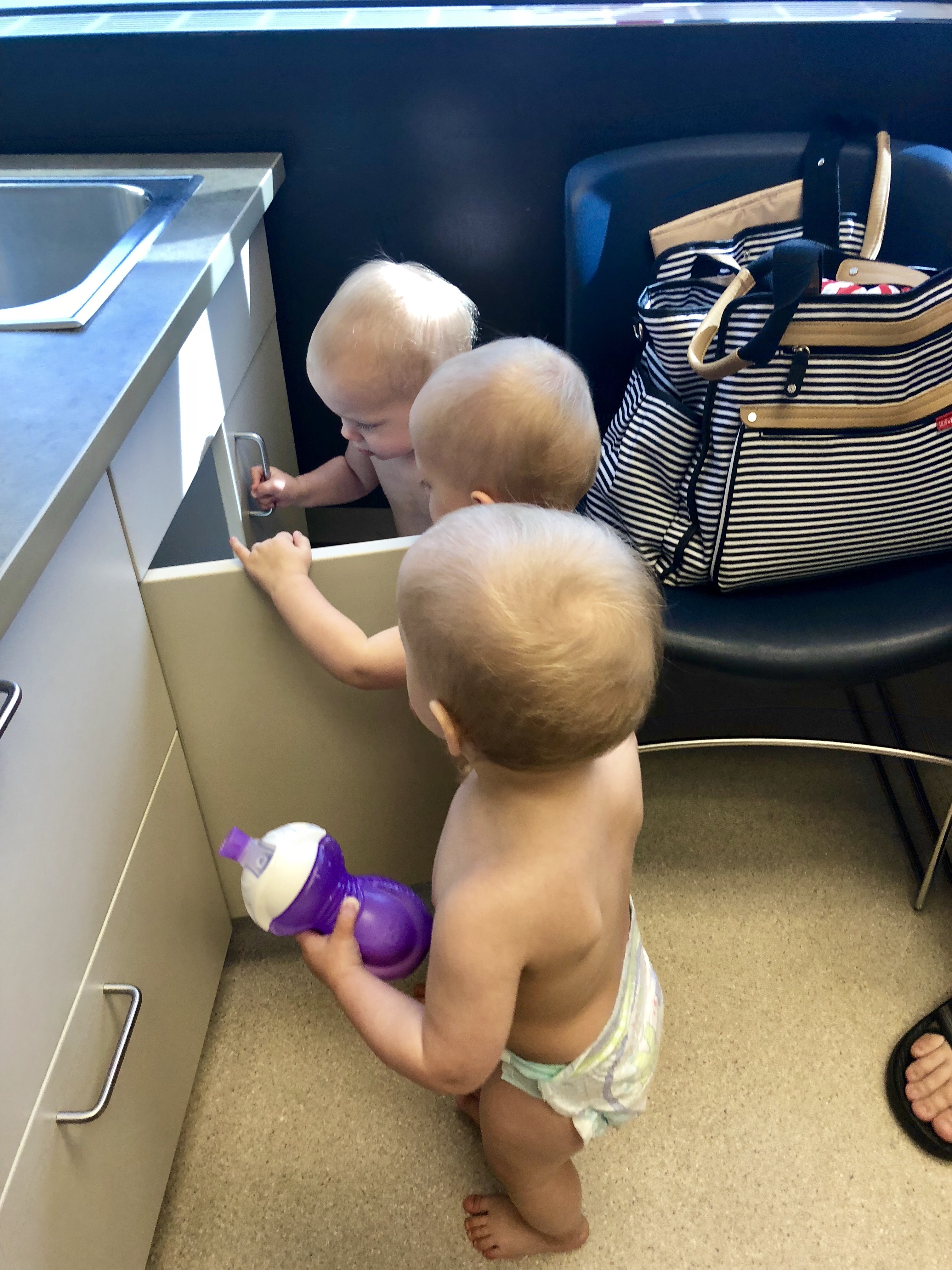 For the most part we have the danger zones blocked off on the main floor. They can’t climb into windowsills because it’s blocked by a baby wall, the couch and diaper changing area also behind it. Every once in a while someone will discover they can squeeze behind the armchair and make it to the windows, but this typically results in minor baby fights and enough yelling that we intervene and reset the blockade.