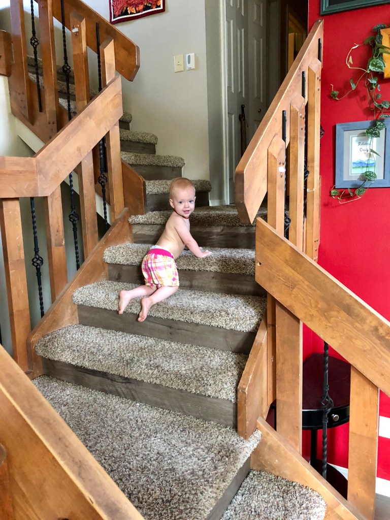 At first we were skeptical about stair climbing, even after PIC clearly suggested we start it. The girls proved us wrong and mastered it not only quickly, but really well; they are already pros at it. The next logical “step” (haha) is to master going back down (safely), and while I’ve been a bit more apprehensive about it, Craig is proven right that they are ready for it. Ready for it, other than the occasional I will learn forward with my full body weight and forget I’m on the stairs…. The girls now climb up the eight stairs to the bathroom for bath time, and we are starting to add to the cycle by going back down afterwards. Craig will holler at them to come up once stripped down from their post dinner, full-of-food clothes (still with diapers on mind you-I learned that lesson!!). They will run across the living room and up the stairs, then full sprint down the hallway and into the bathroom. Most of the time they don’t divert into a different room or try to climb up to the loft; every once in a while it becomes an impromptu game of tag, 3 versus 1…