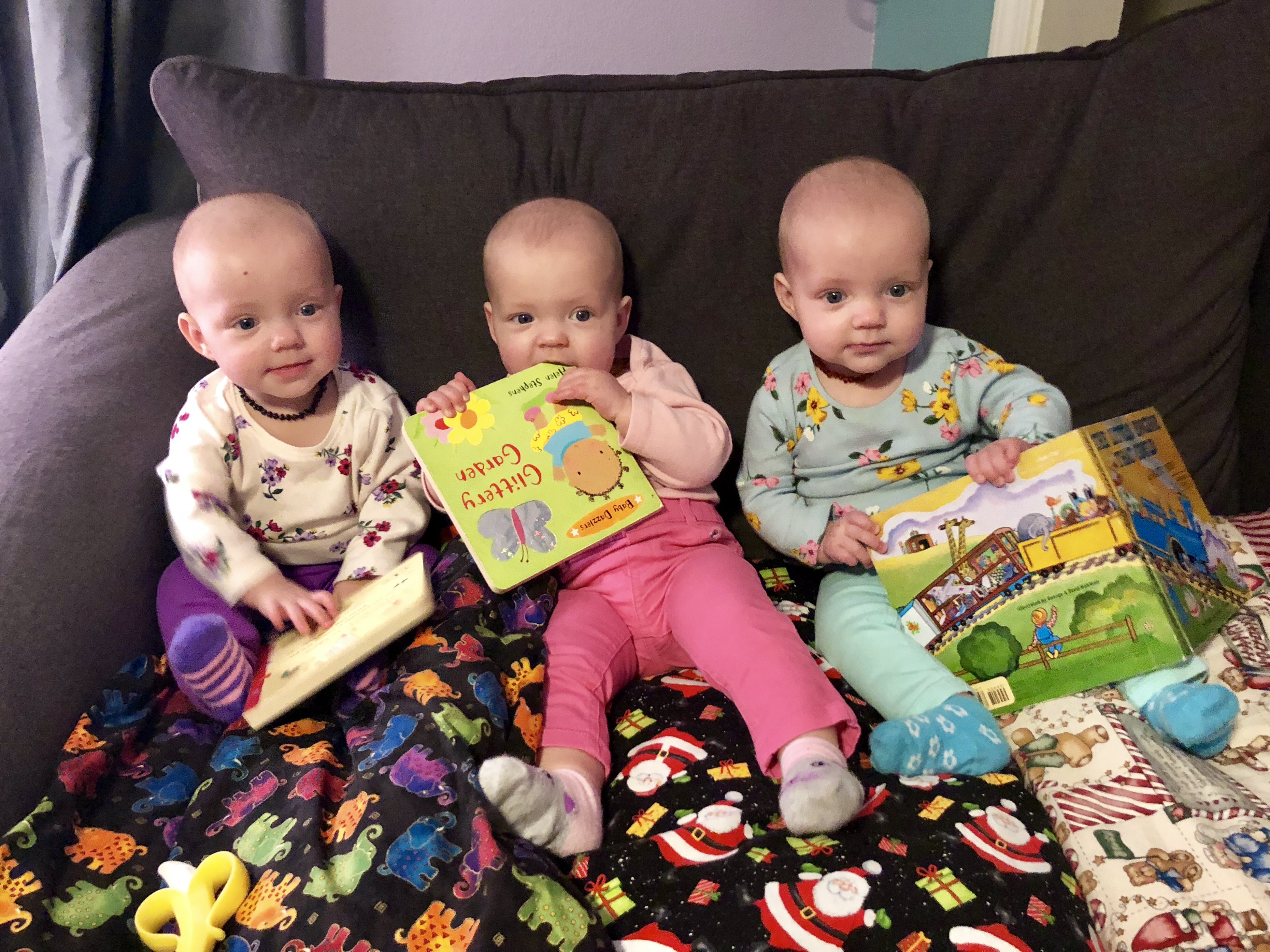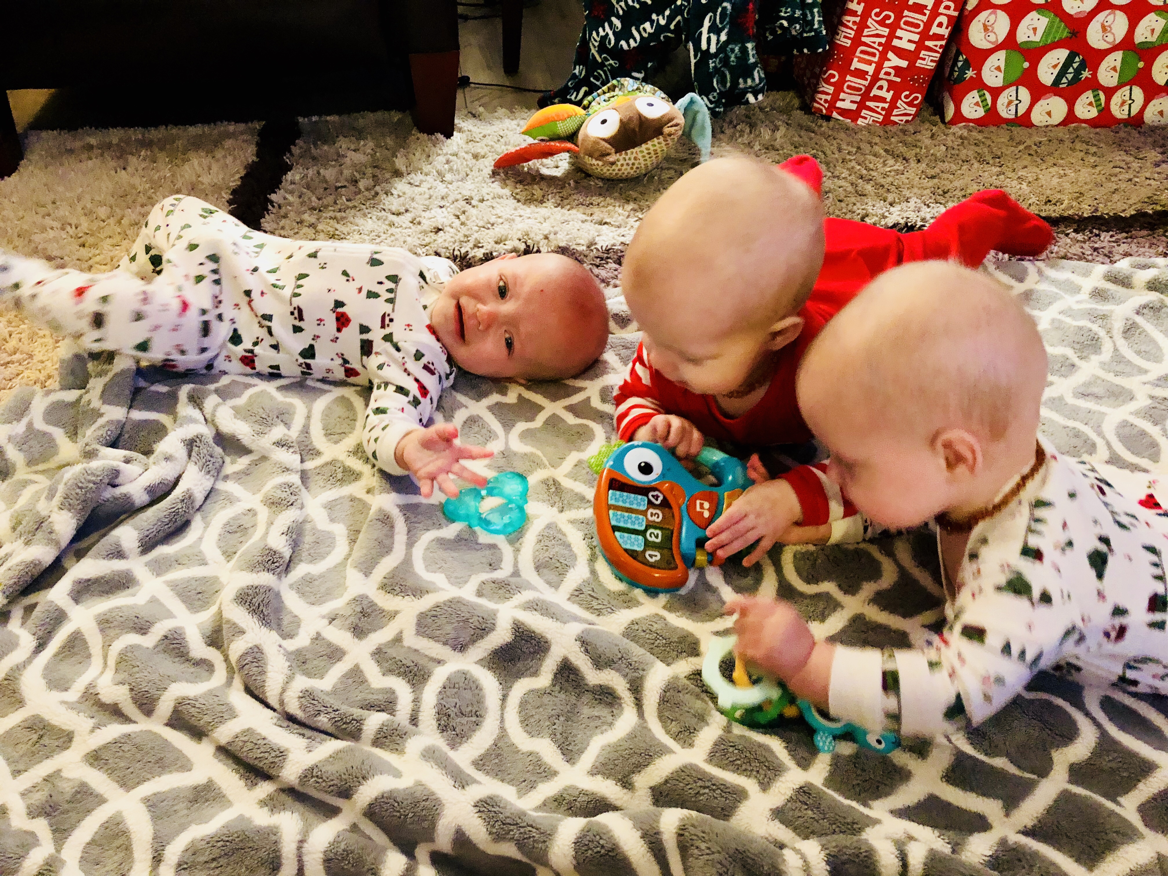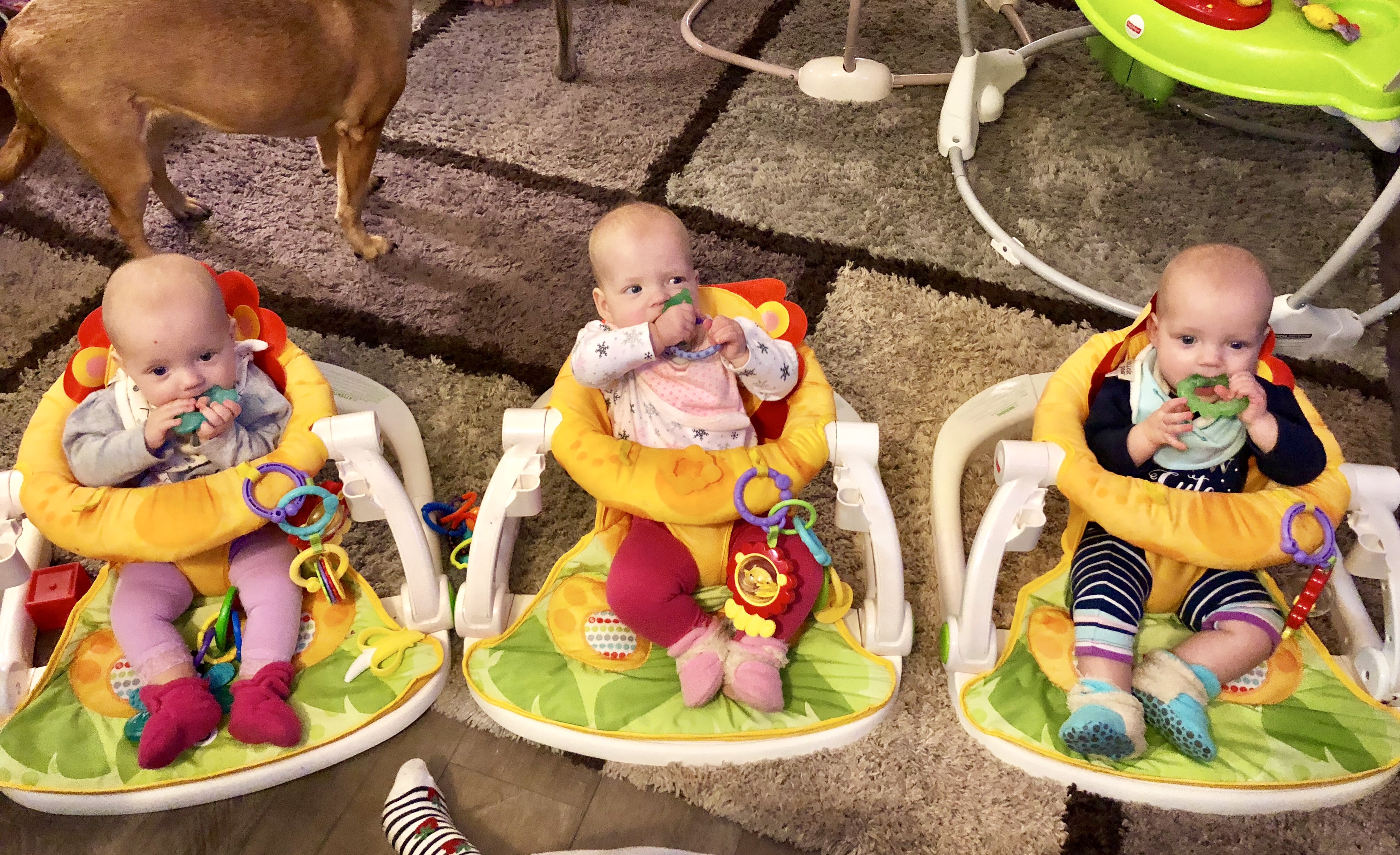Another activity is tummy/sit time on the floor with all three. They are getting much stronger at sitting up and can do it pretty well with only minimal assistance needed. During this time, the girls are starting to steal each other’s toys and look around for anything fun around them. There is always a plethora of teethers to choose from.