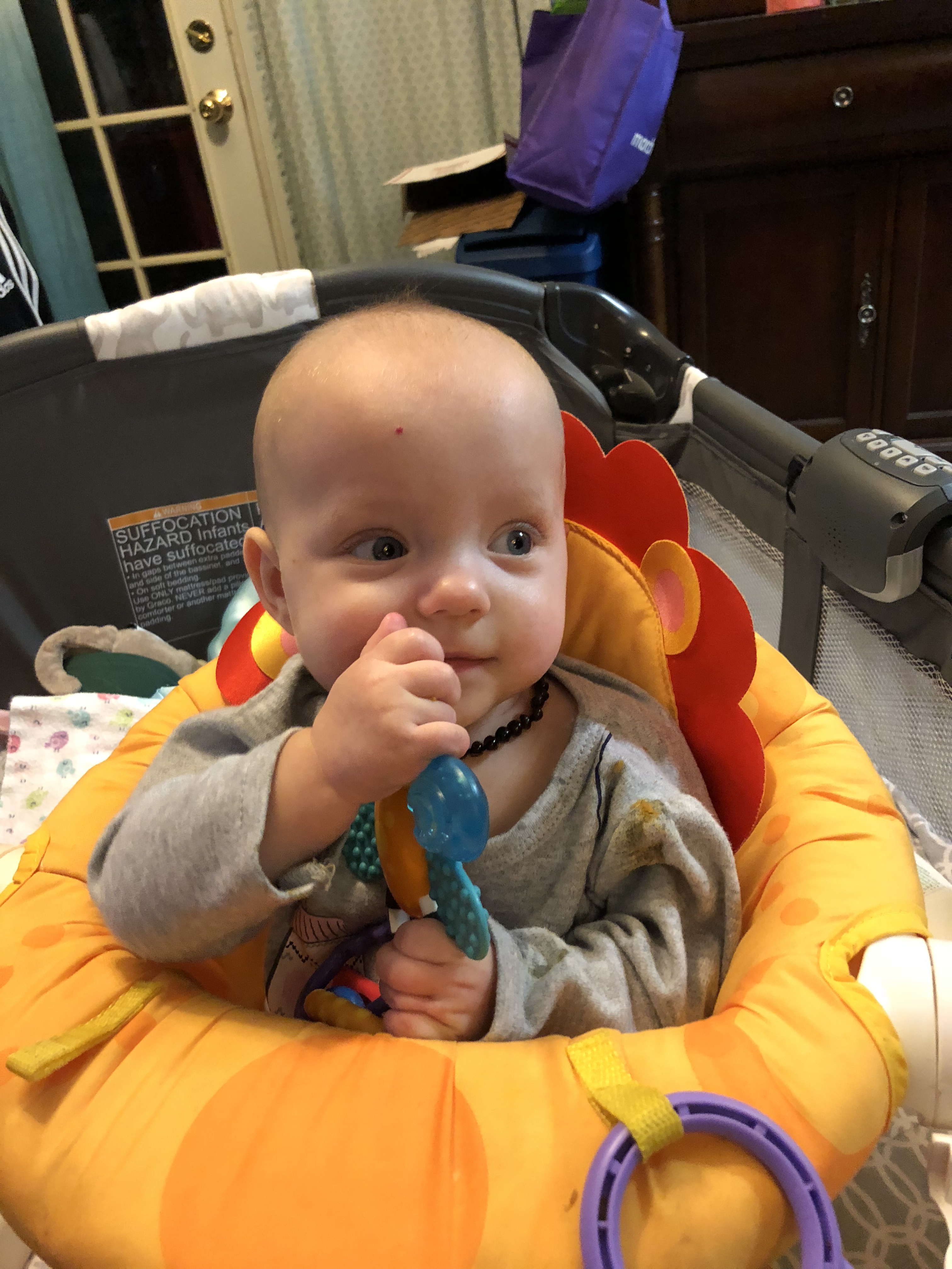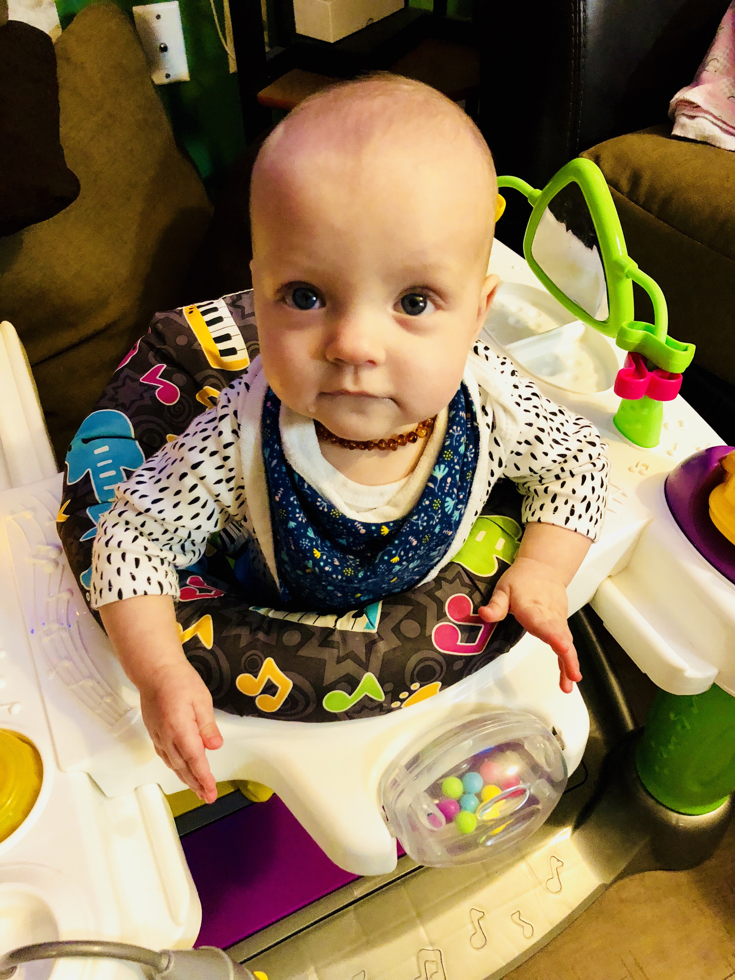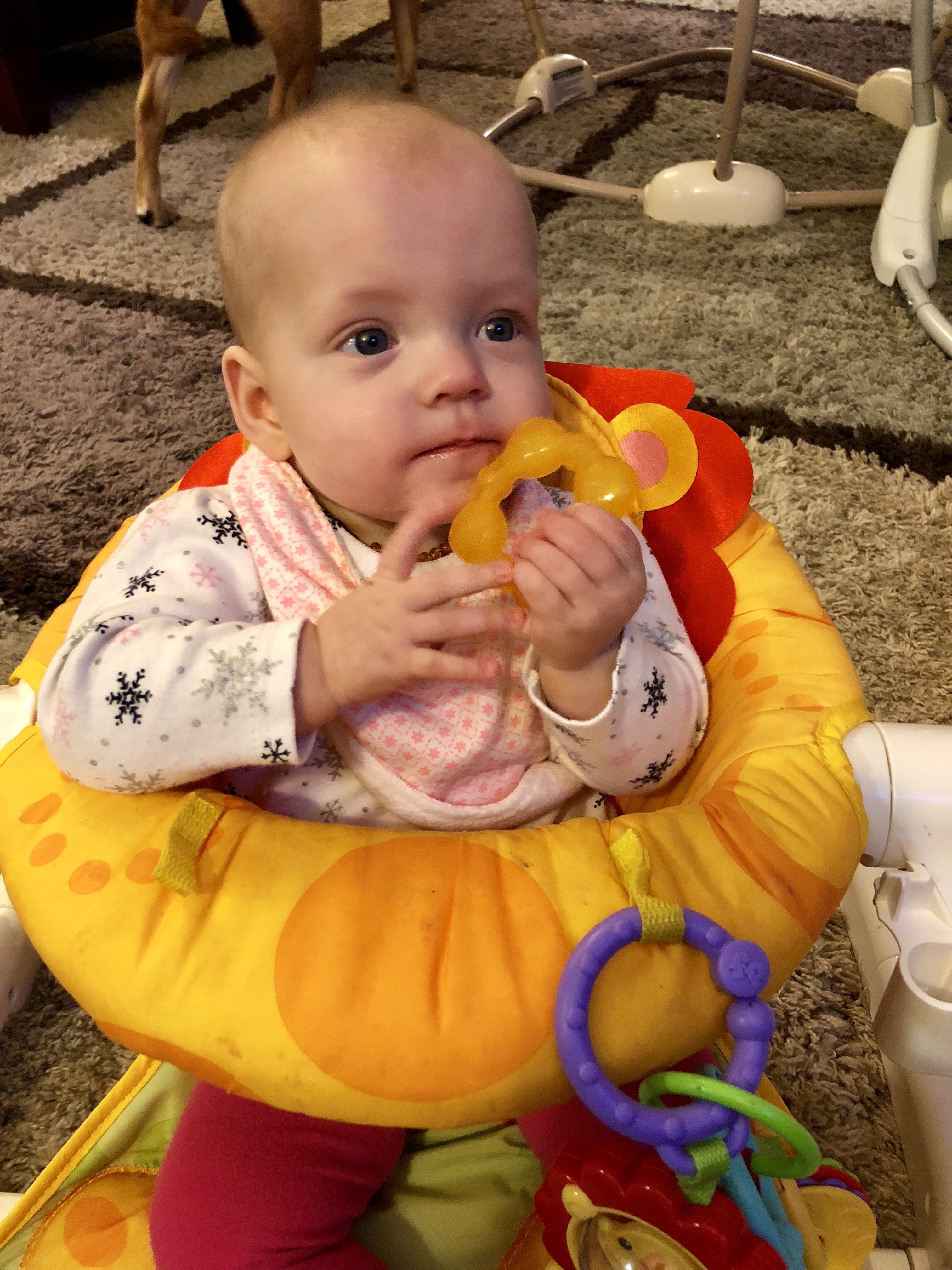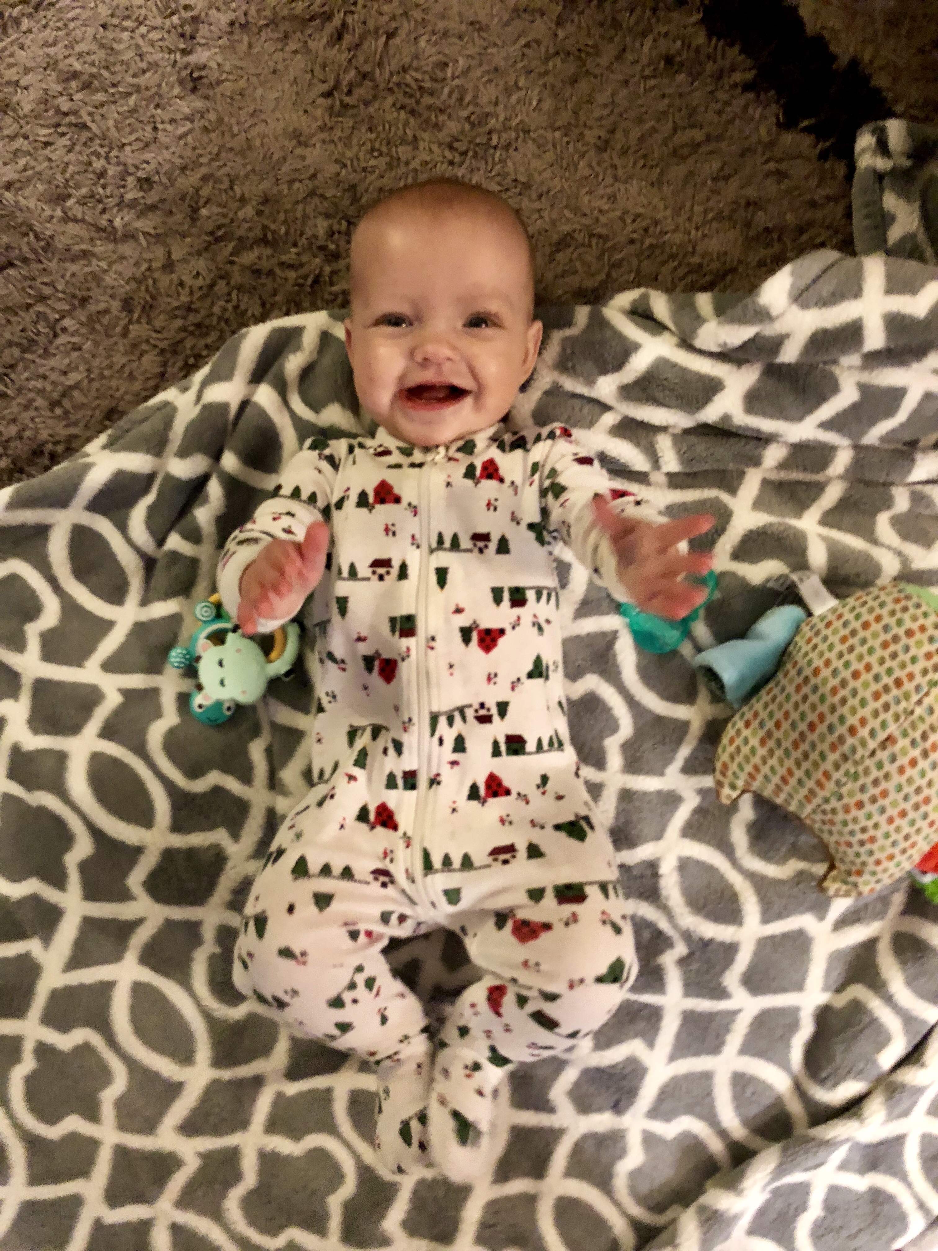 Development: While we try to encourage it, Harper has decided rolling over is not something she is interested in learning STILL. She has done it twice. She is great at sit time and can hold herself up pretty well and reaches for toys in all directions. Harper does like to chat and is now saying “dadadadada;” that, or she’s growling at you.