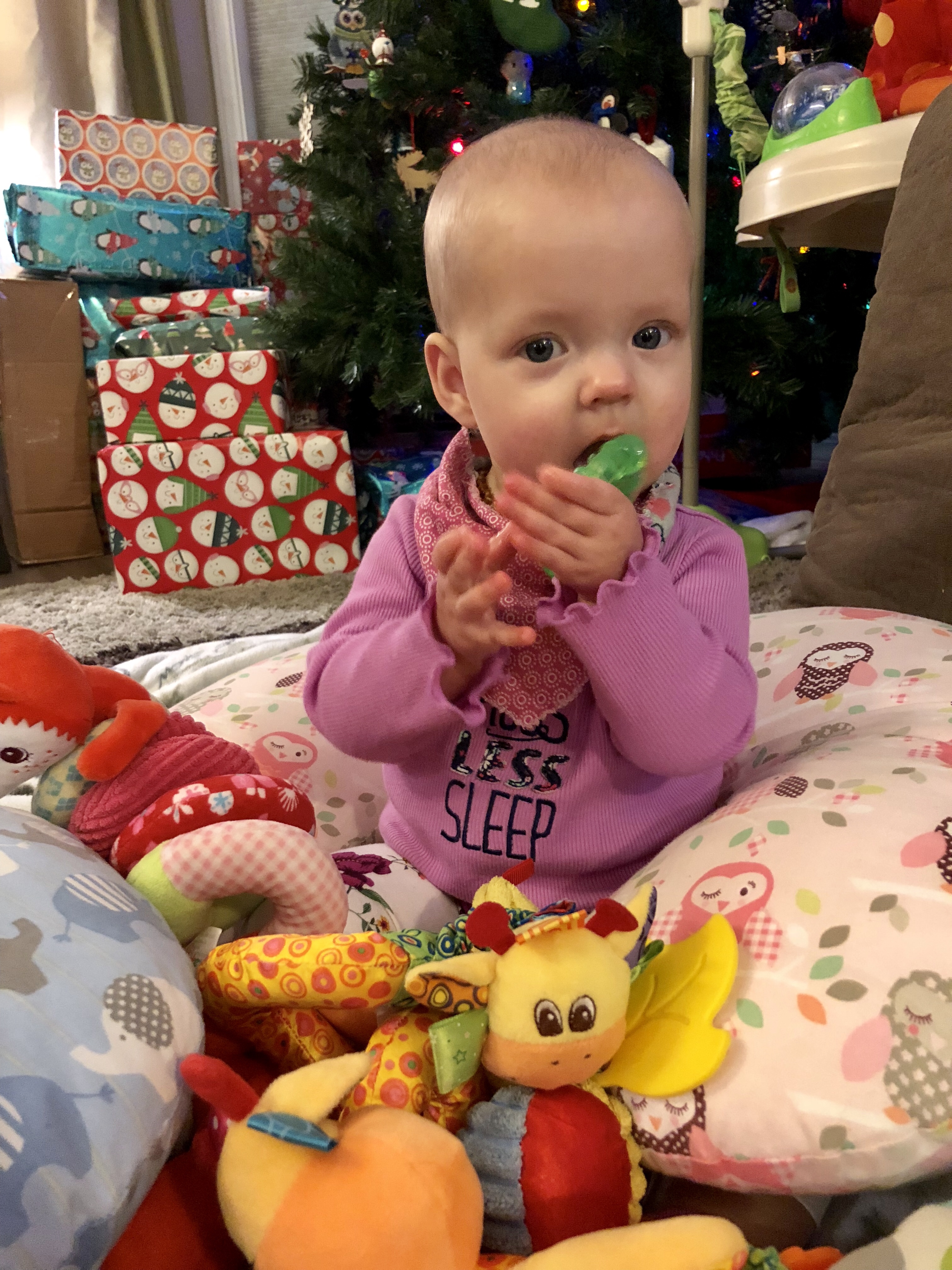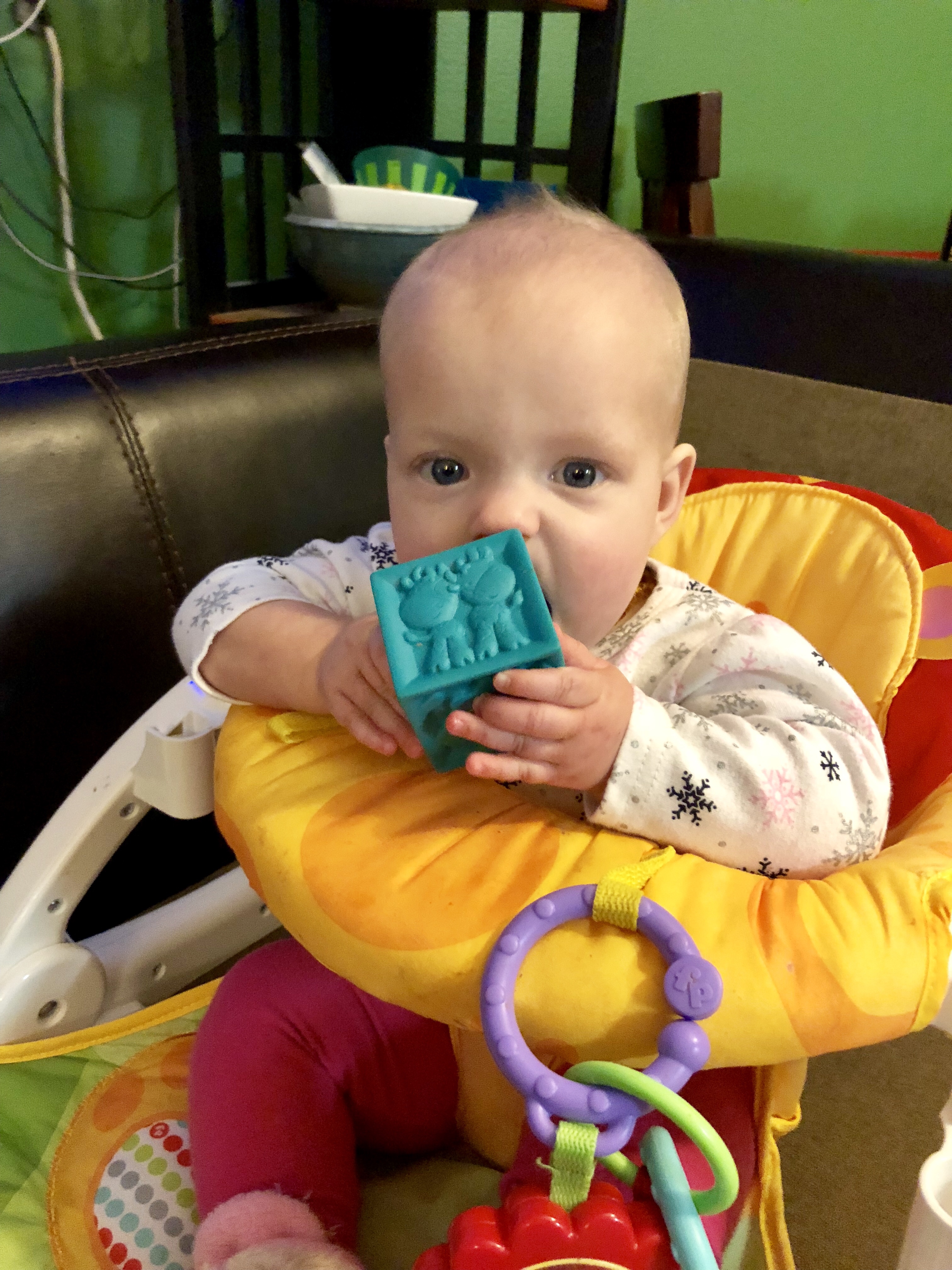 Likes: Toys. Reagan is definitely the toy hoarder. She tries to gather all toys near her into her lap; it does not matter if Harper or Emerie are chewing on said toys, they will be hers… She especially likes toys that sing and light up, and her singing toucan! Reagan also took to the frozen teethers the fastest. Lastly, she has a happy shriek sound that is the sweetest thing!