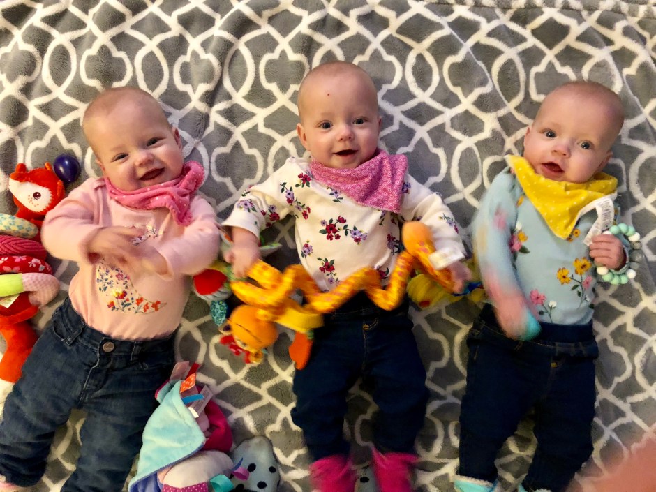 All three girls reach out for Mom and Dad now as well as for their bottles. We still receive big smiles in the morning, although lately those come from the rock-and-plays instead of the cribs!