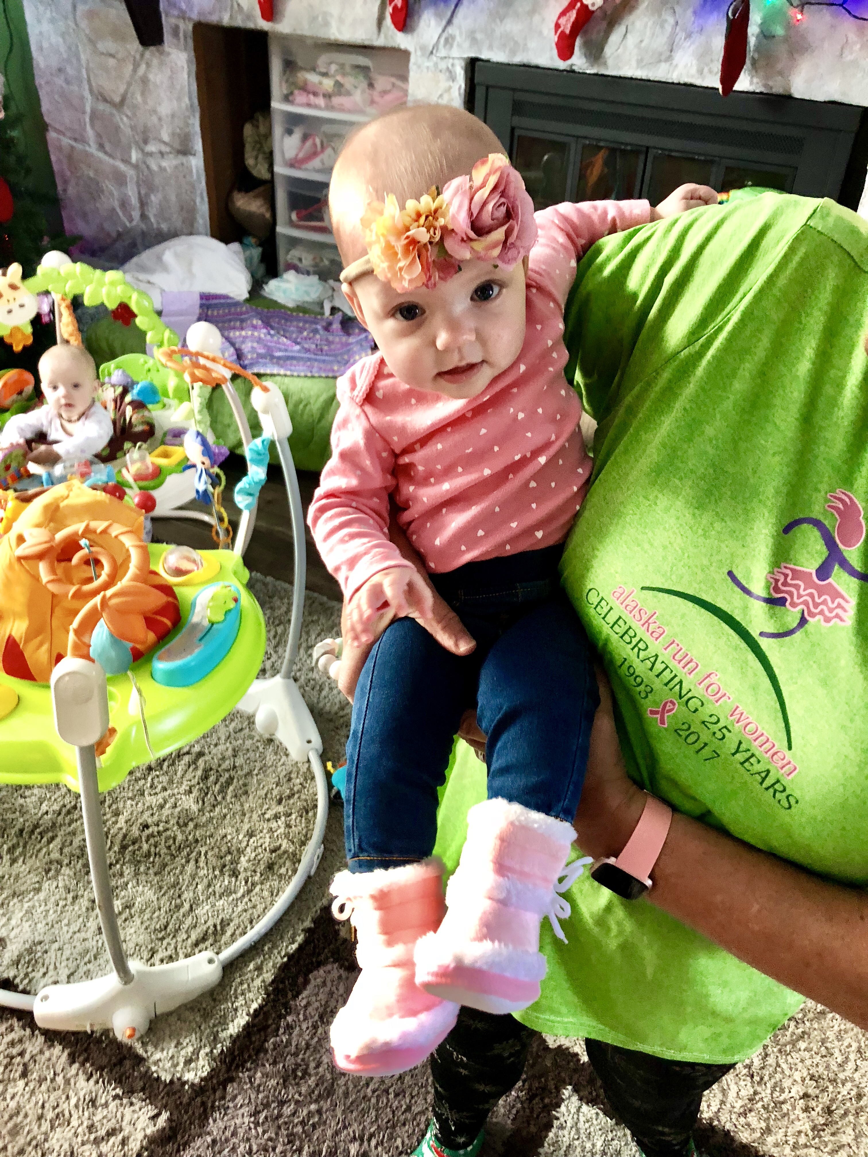 Daily baby activities now include lots of jumper time, for everyone, rotating who goes in which one as they all have different things to play with and chew on. Sometimes we make 30 minutes with three happy babies, sometimes one adamantly refuses to jump at all and wants to be held, and sometimes no one is in the jumping mood, although that’s rare. The bouncers are now liked (previously hated) and all three girls think it’s hilarious to pound their legs as hard as possible and pull on the dangly toys. That results in a little enthusiasm as well.