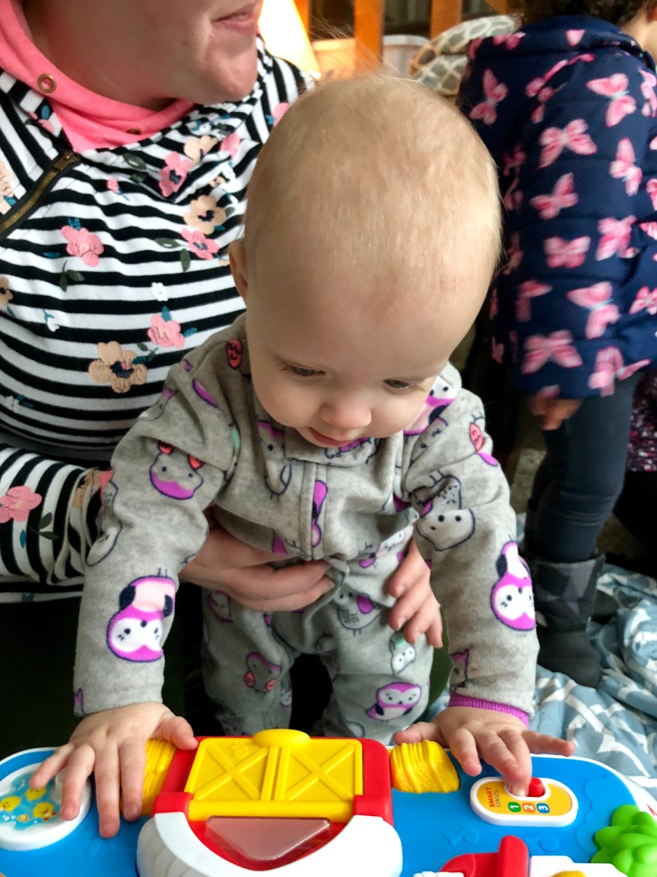 We broke out the activity table they received from Christmas and all three think it is about as cool as the ceiling fan! In fact, when one is playing on it (assisted by parent), the other two are insanely jealous and let us know it should be their turn ASAP!