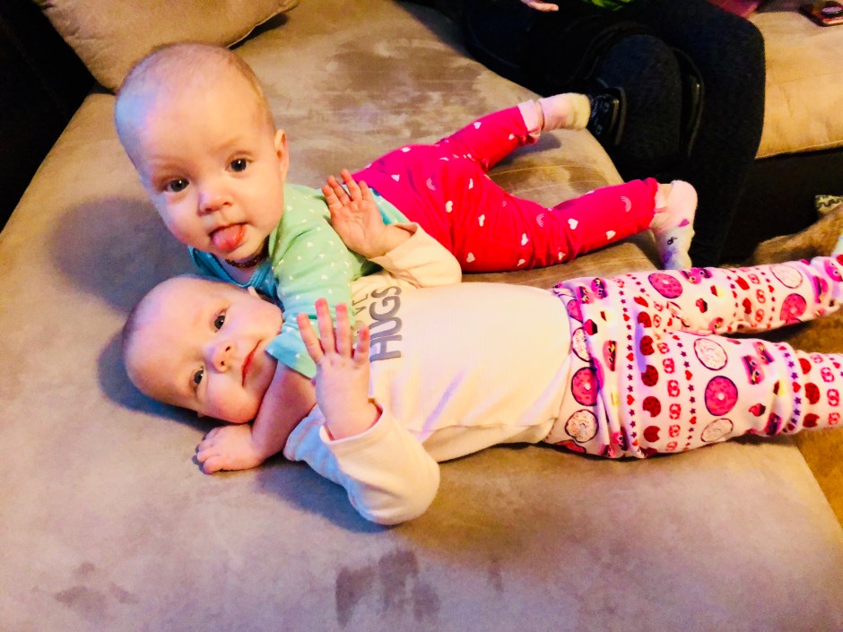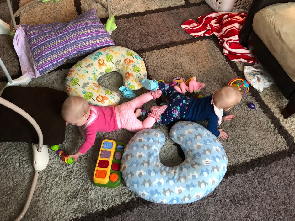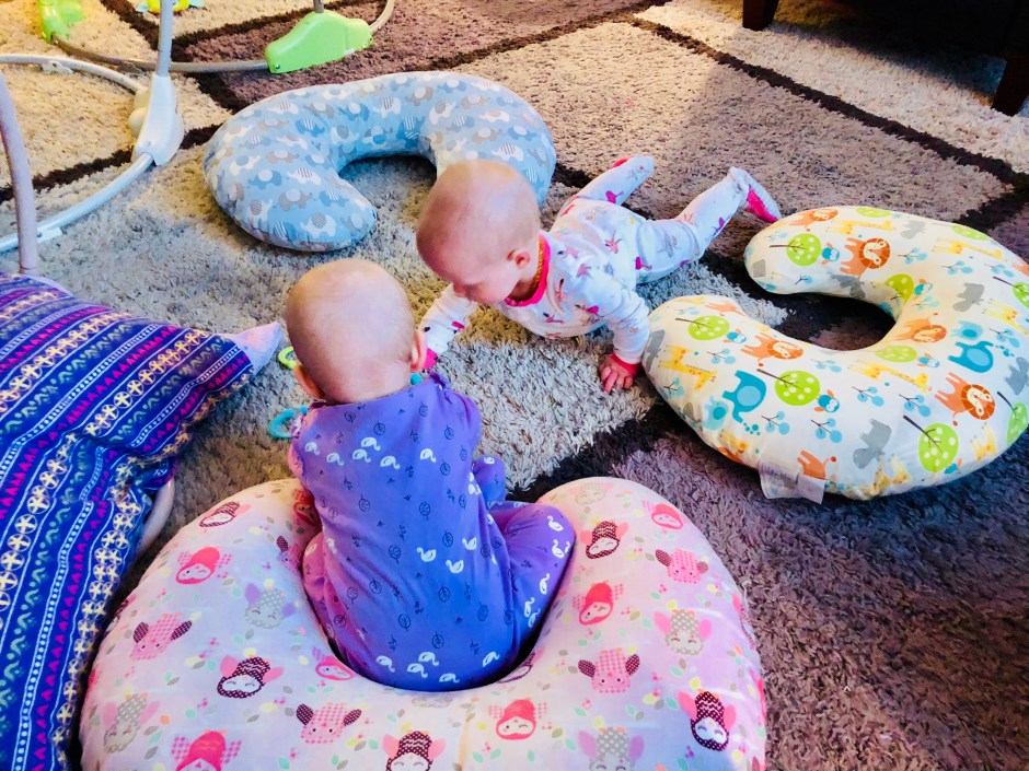I now can’t turn my back without someone rolling over or moving spots. They aren’t quite crawling yet, but Reagan is super close. Even Harper, who is not a fan of exerting herself unless forced, is pulling herself back to sit right positions and turning onto her stomach, much to her dismay.