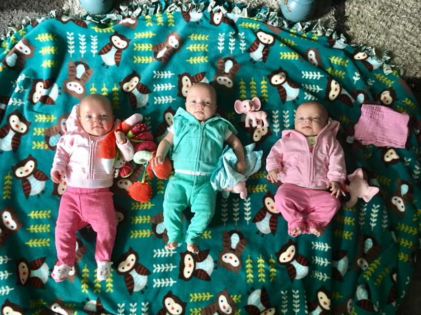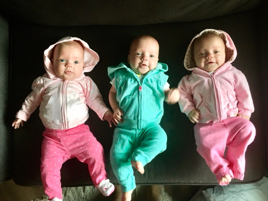 Speaking of growing fast, the girls are getting bigger! Harper and Reagan are currently .4 of an OZ apart, with Harper in the lead at 15# 14 oz. Emerie is catching up at 14# 3 oz. 6-9 months clothes are washed and organized and starting to be used.