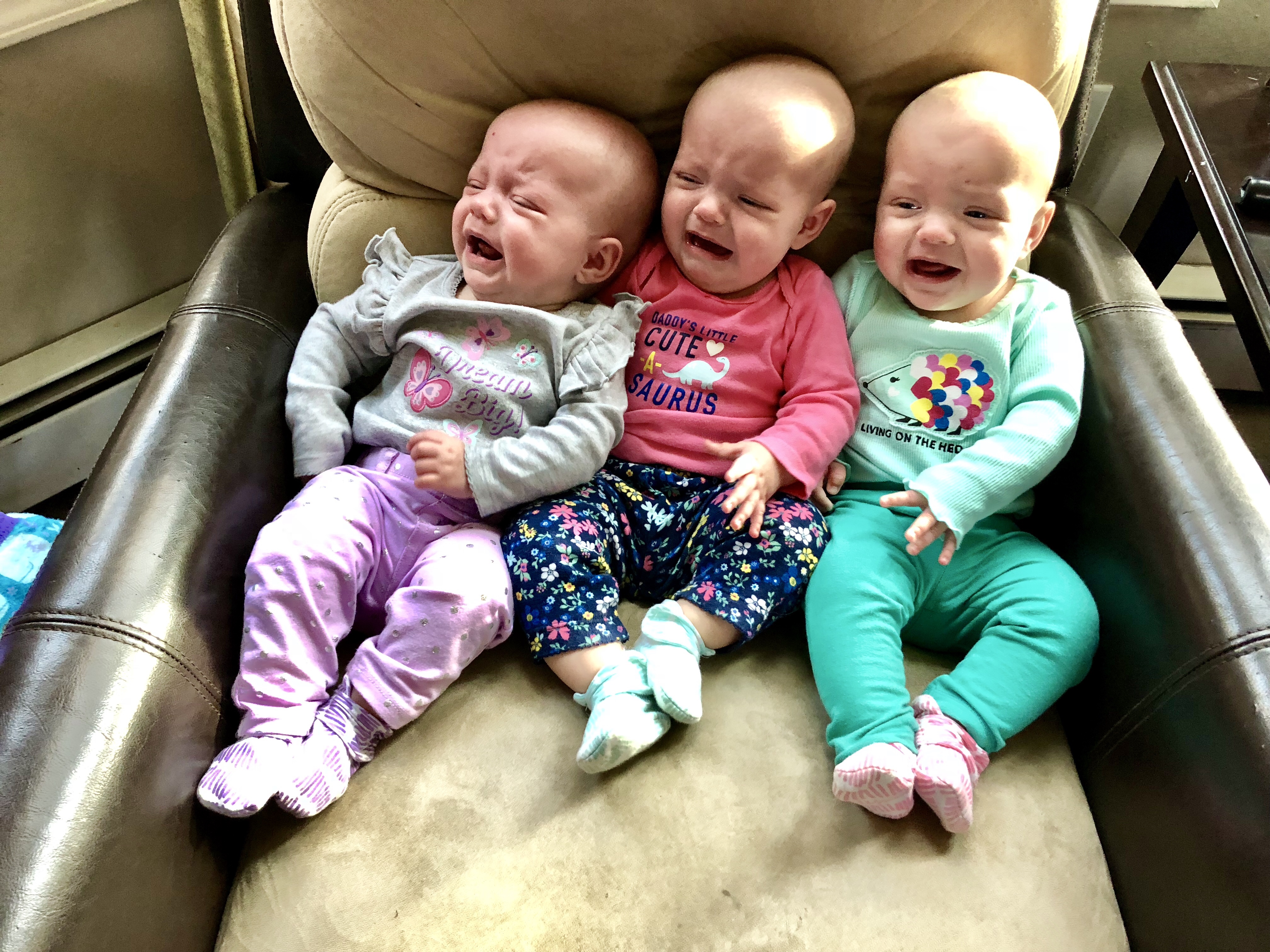 The past month is full of small developmental milestones. We survived leap four and are now onto leap five, which is basically about relationships and space. They can now tell when we walk away from them (super fun…) or when something is in their personal space (like a sister). Binkie use is progressing nicely and they hold them and chew on them, although not quite correctly. Emerie constantly takes hers out of her mouth and then screams, like “who did that!?”. We are still working on that one…
