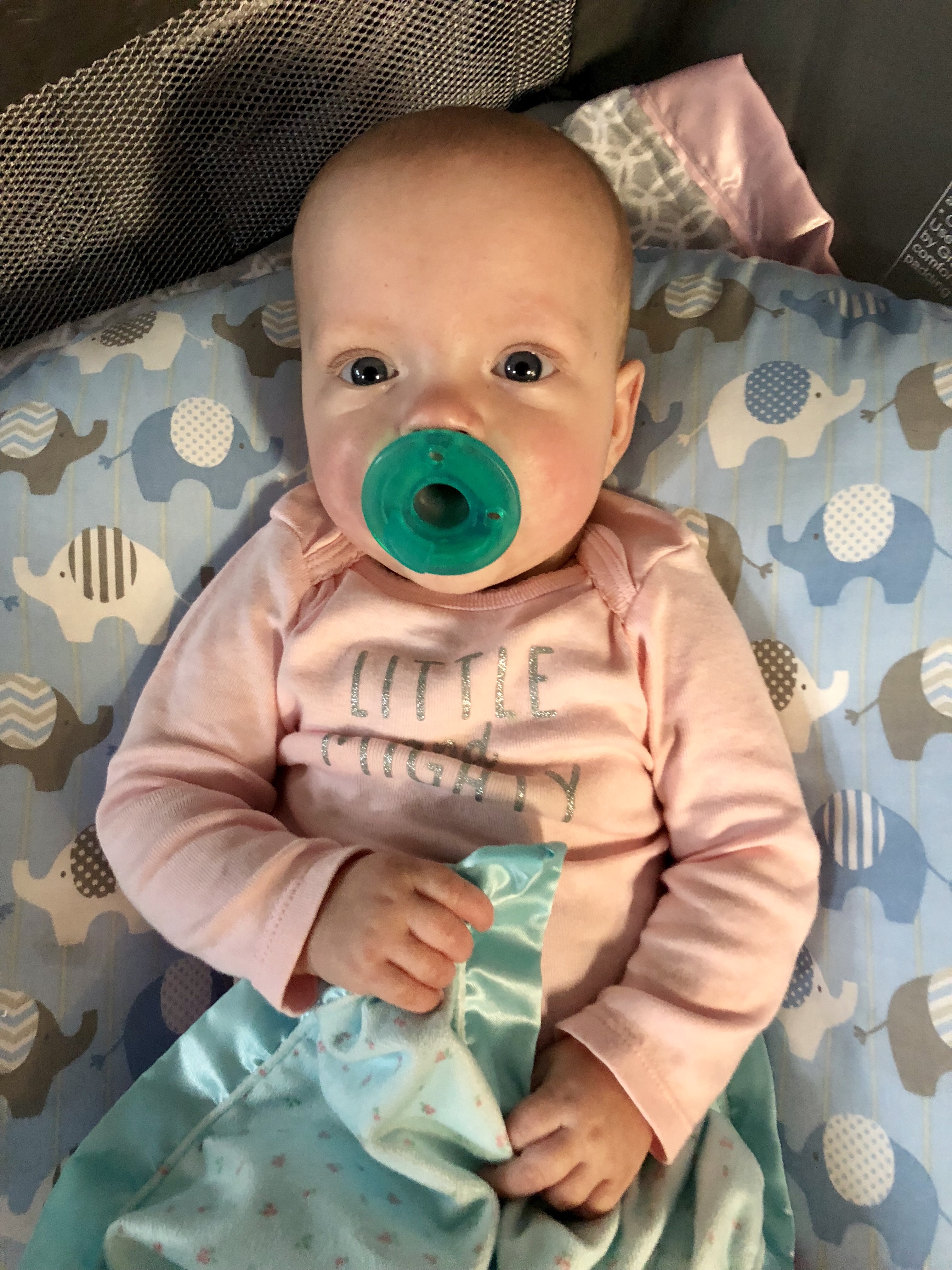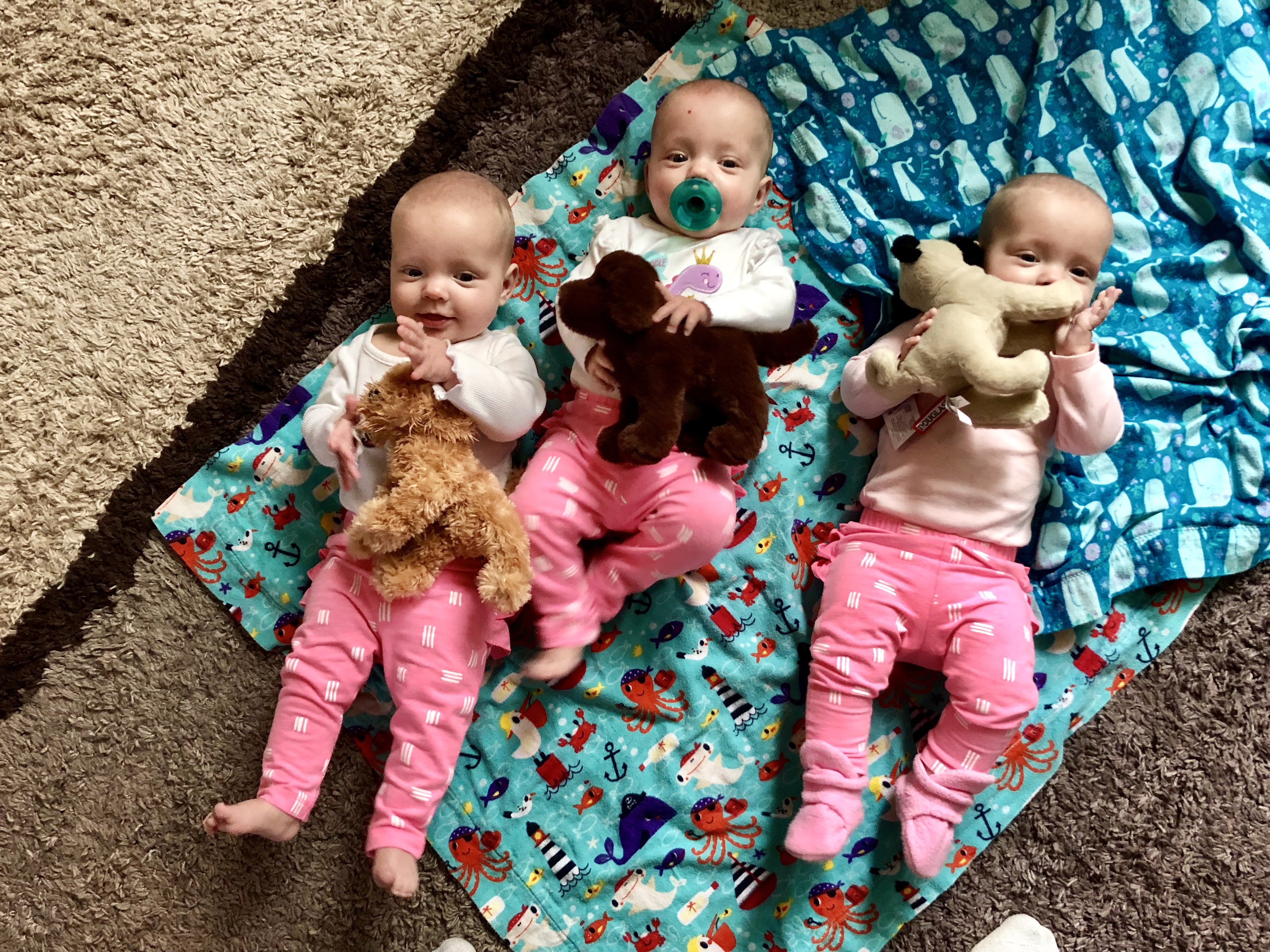 Reagan is really figuring out her hands. If I hold a toy up for her in front of her hands, she will grasp it and put it in her mouth. Such progress! Harper is starting to respond the same, and has figured out thumb chewing. Emerie won’t quite grab toys yet when I hold them out, but I did watch her reach over and forcibly pull a binky from Harper’s mouth and throw it across the pack and play…so there’s that…