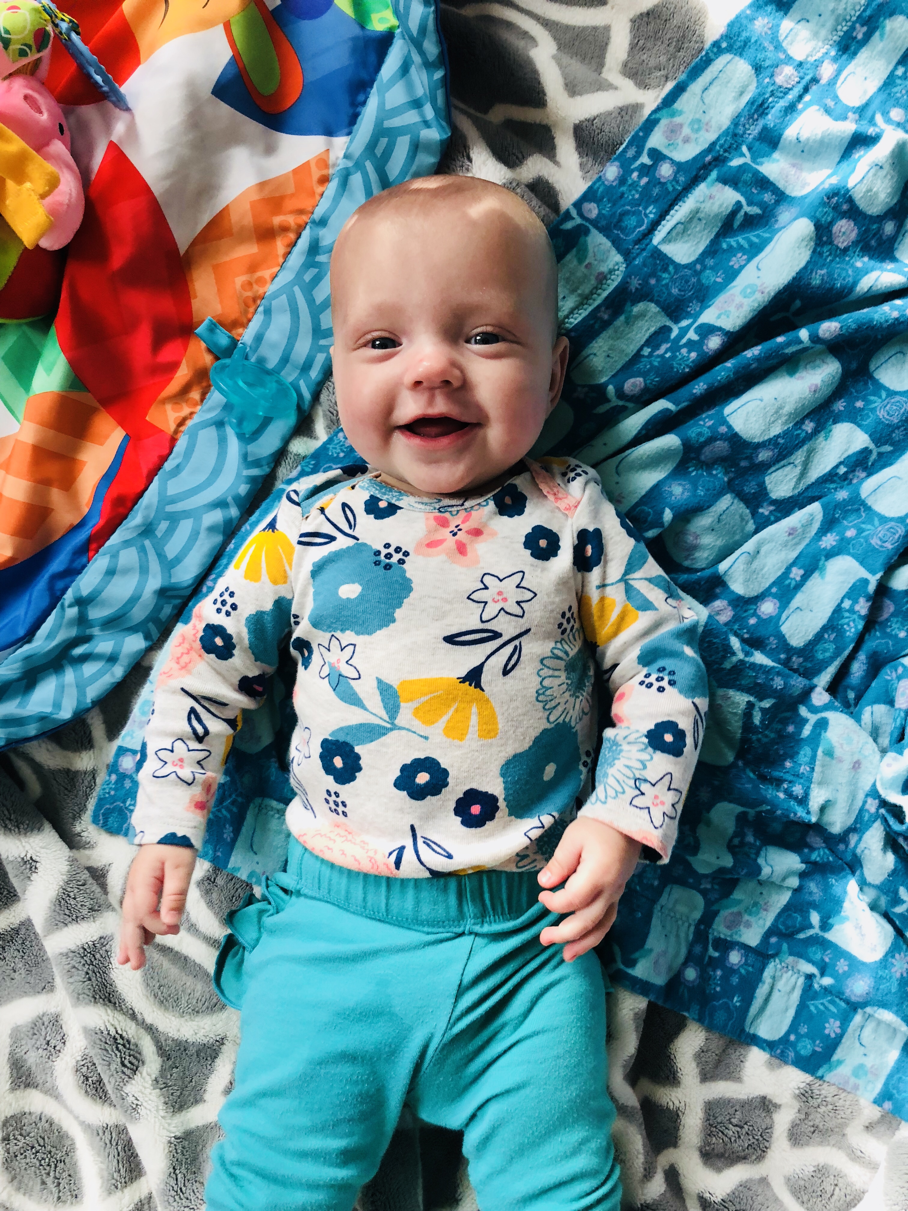Everyone has figured out their feet exist, although I think Emerie likes to play with hers the most. She is also teething like crazy with a tooth peeking on the bottom right.