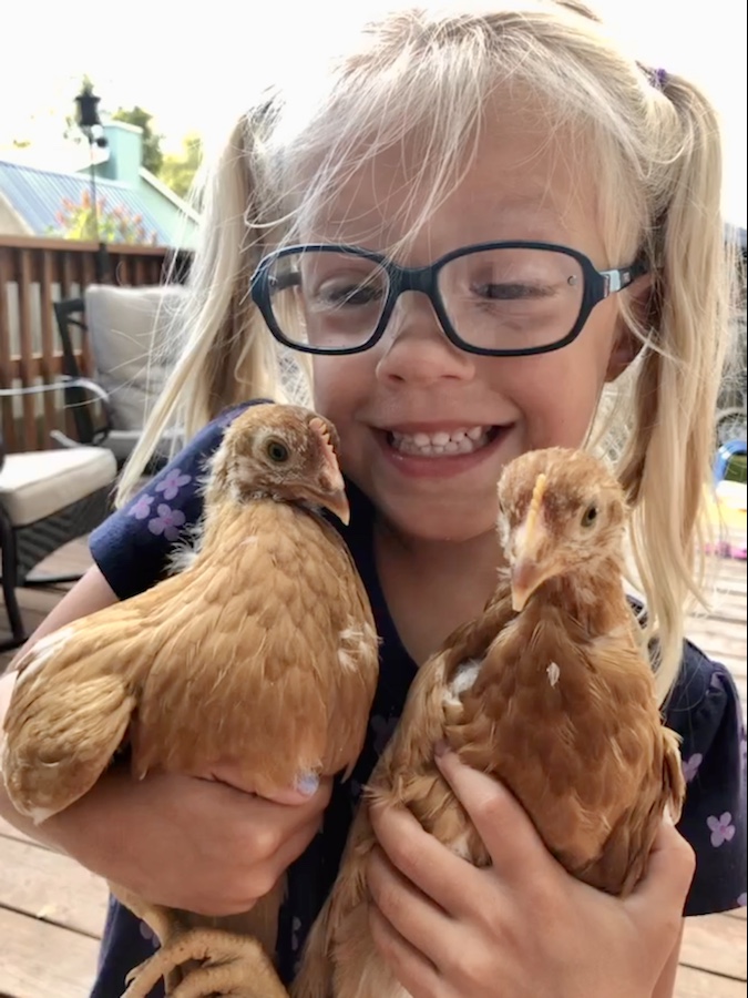 This month Emerie found a new bestie, whom she named Pella (NOT Bella, she insists), and she lives in the form of a chicken. She’s great at spotting her (lightest feathers) and loves to take the darn thing all over the yard, snuggle her in her dress, and scold her for pooping on the deck. She constantly expects this poor chicken to be obedient and listen to instruction. It’s hilarious to listen to a four-year-old complain that her beloved chicken won’t listen to me and inspires frustration….I wonder what that feels like!