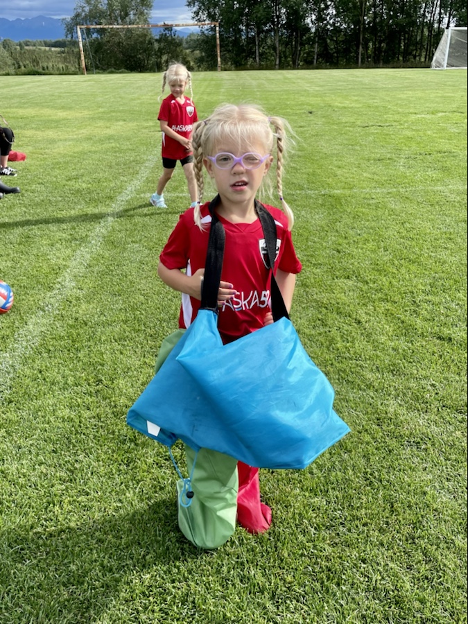 Harper had her good moments of listening and running back-and-forth, Reagan had her good moments of the same, and Emerie was by far the least excited to participate and opted to stay sitting at Craig‘s feet for most of the session. She found entertainment in wearing all of the portable chair bags rather than running around with a soccer ball like the other kids. At one point she was jumping on top of her soccer ball and falling as it slid out from under her, laughing from the ground. Luckily she found her groove the second night and really enjoyed it.