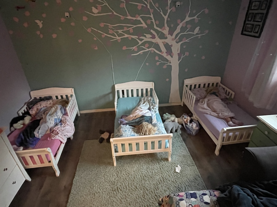 A couple weeks back we rearranged the girls’ toddler beds a bit in hopes of better overnight sleep. Did it make a difference? Of course not. But hopefully it’ll keep Emerie from overheating next to the heater all night. Well, I should say for the few hours she actually sleeps in her bed each night.