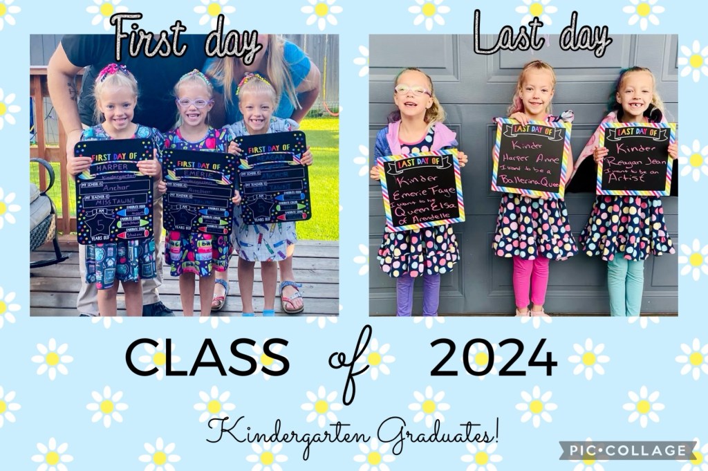 What a whirlwind few weeks! The girls made it through their first year of elementary school and are already excited to claim first grade. While displeased that beloved Miss Tawni won’t teach them next year (since they assumed she moved up every year haha), they also contain excitement for Miss Kelly, who is just a couple doors down the hall. Looking at comparison pictures from day one to the final day, you can see how much everyone grew, not just in height!