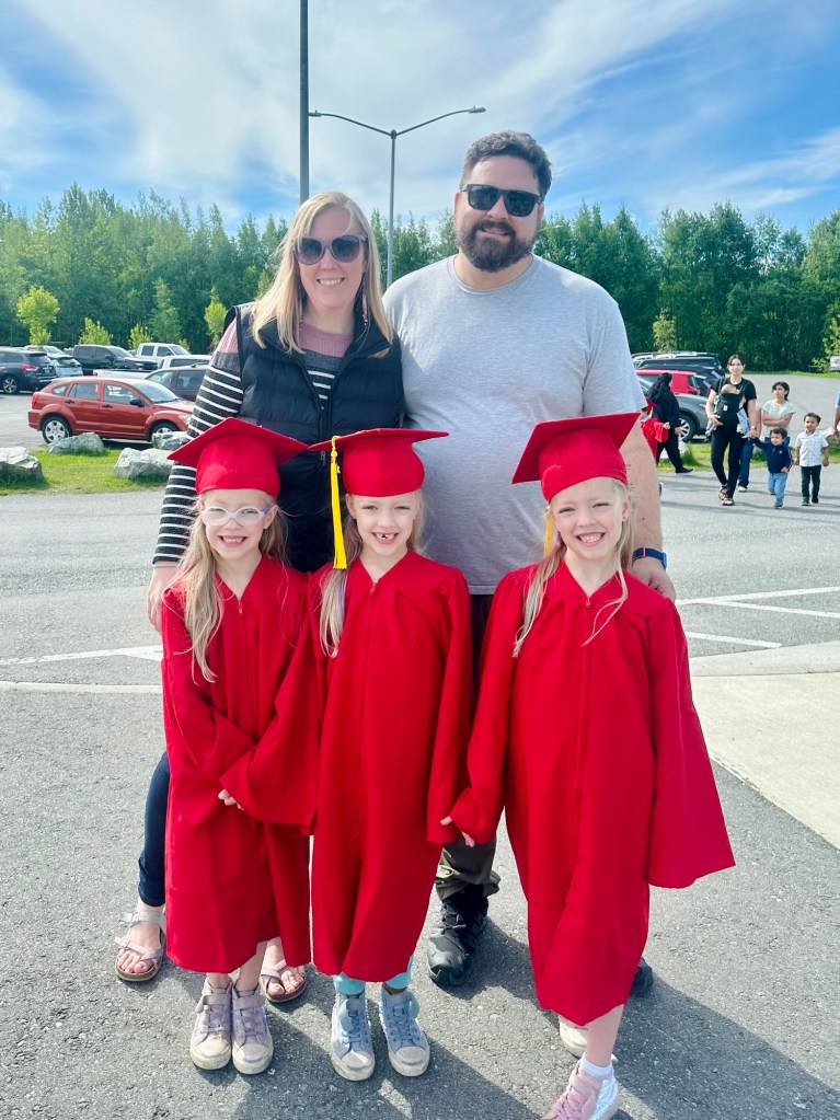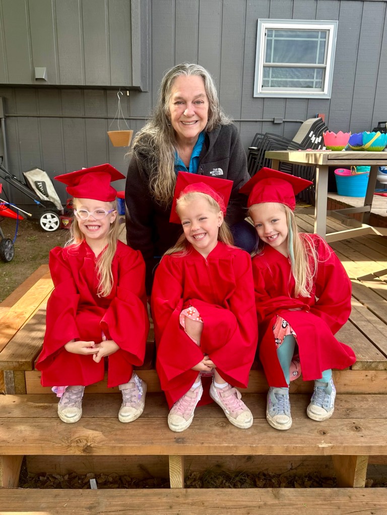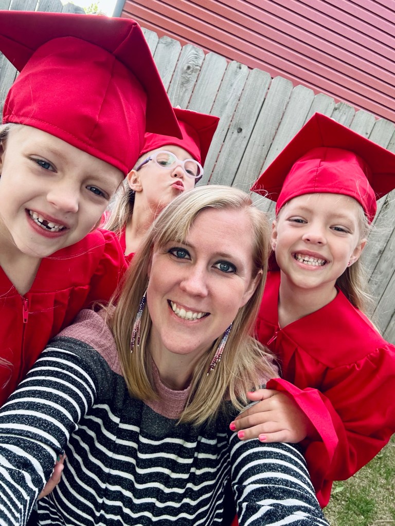 On graduation day, the girls were uncertain why they had to wear loose gowns and weird caps, but went along with their crazy mother and were good sports about it. Grandma Sue and Miss Tawni were able to attend and join in the fun, and the sun came out just for that day, so their name calling ceremony wasn’t rushed and miserable. Everyone lined up and was called down one by one to accept their gift bag. They stood behind their name stars calmly until the last name was called. All in all, I might have had a bit of a lump in my throat; it’s tough hitting these milestones only once, and knowing that is the only time we will experience it, even when it’s three fold!