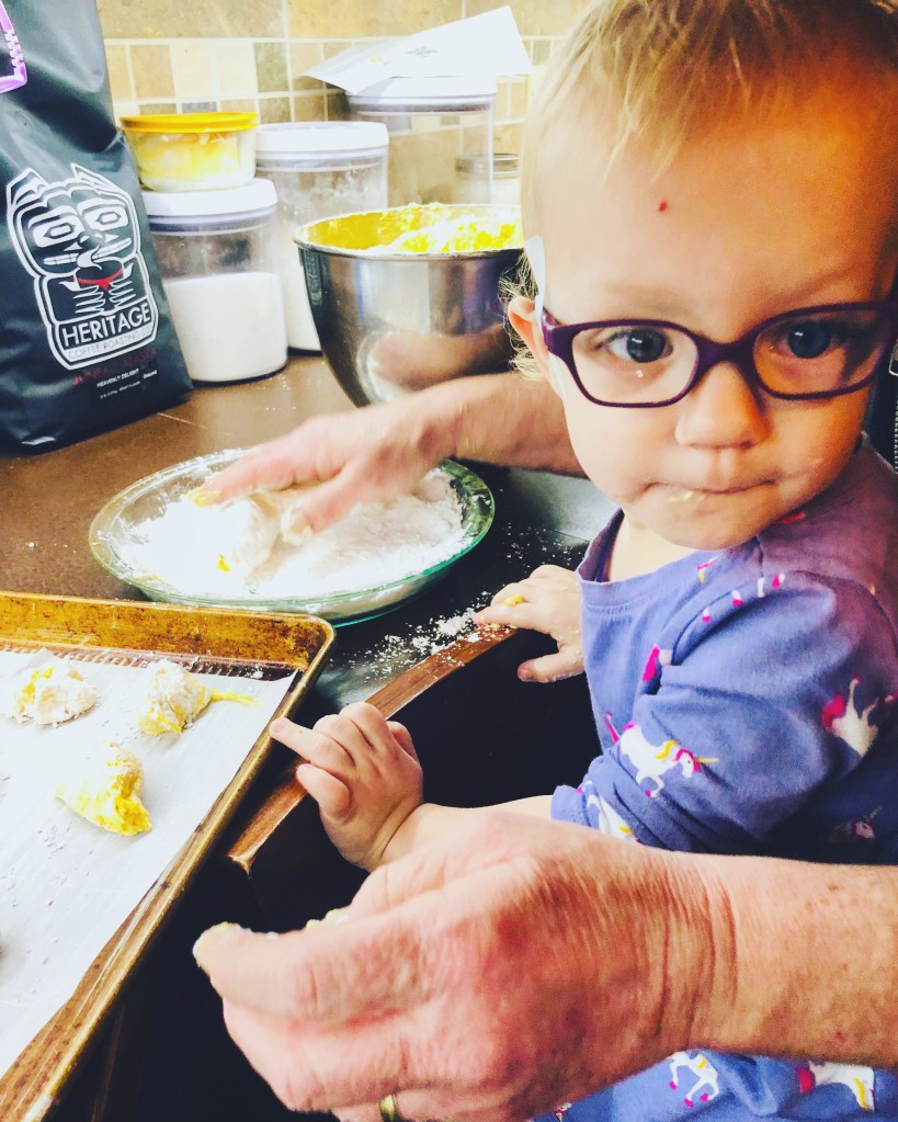 Harper was not a happy camper to wait her turn and Emerie and Reagan didn’t want to stop “helping”. Emerie was the self-proclaimed and certified taste tester and Reagan was such a helper and happy to plop the dough onto the cookie sheet. Don’t worry, the cookies turned out fine!