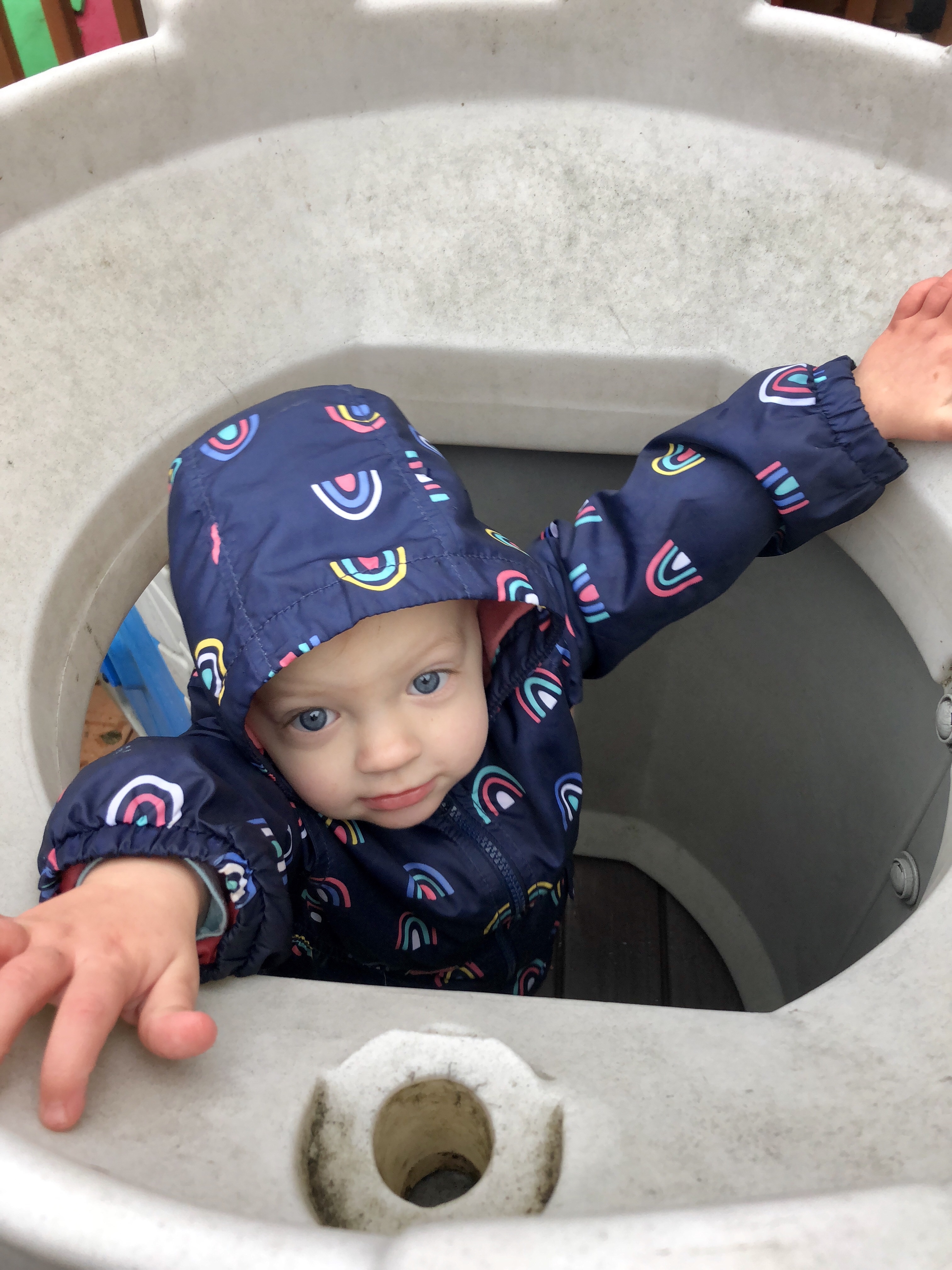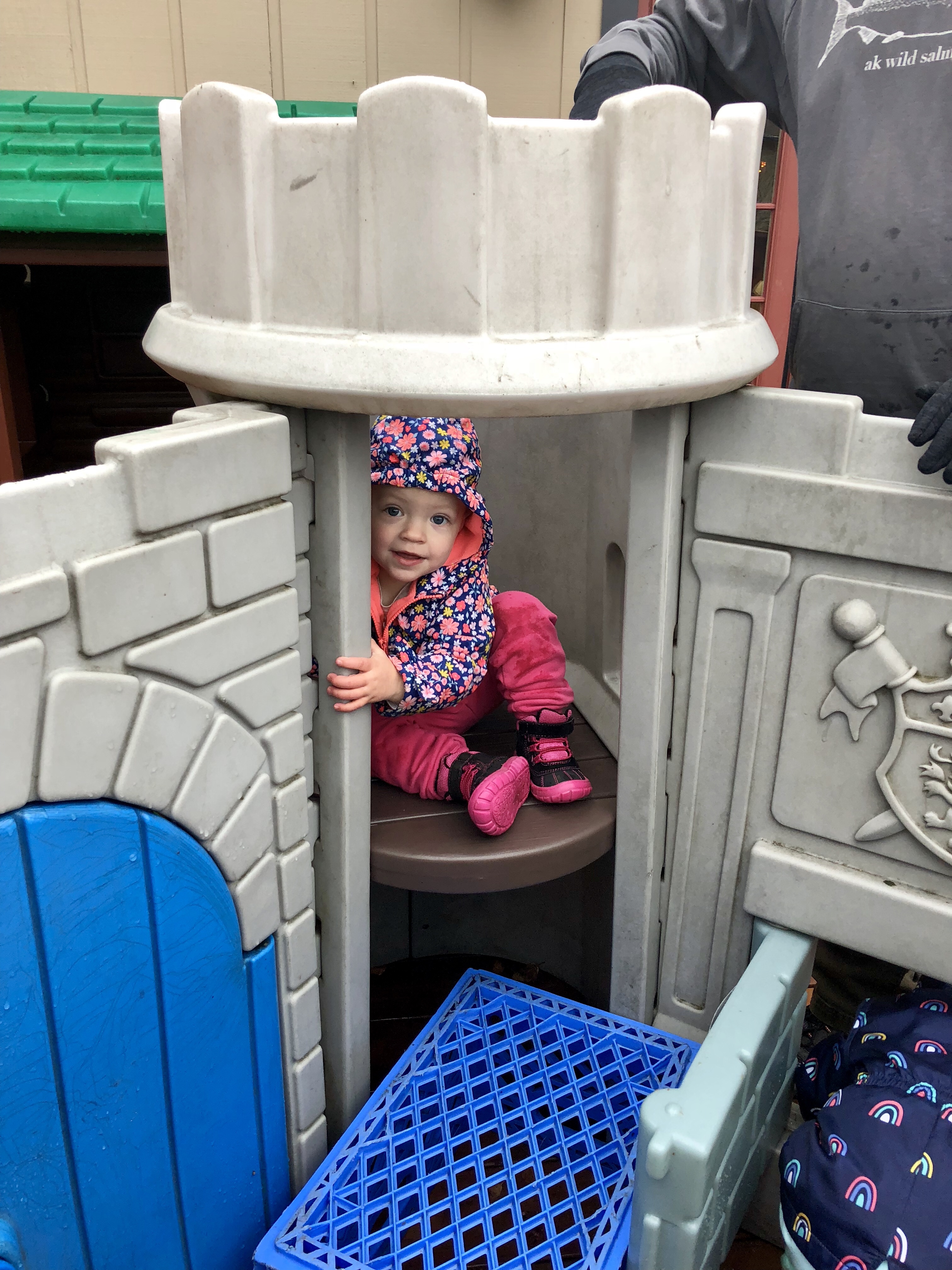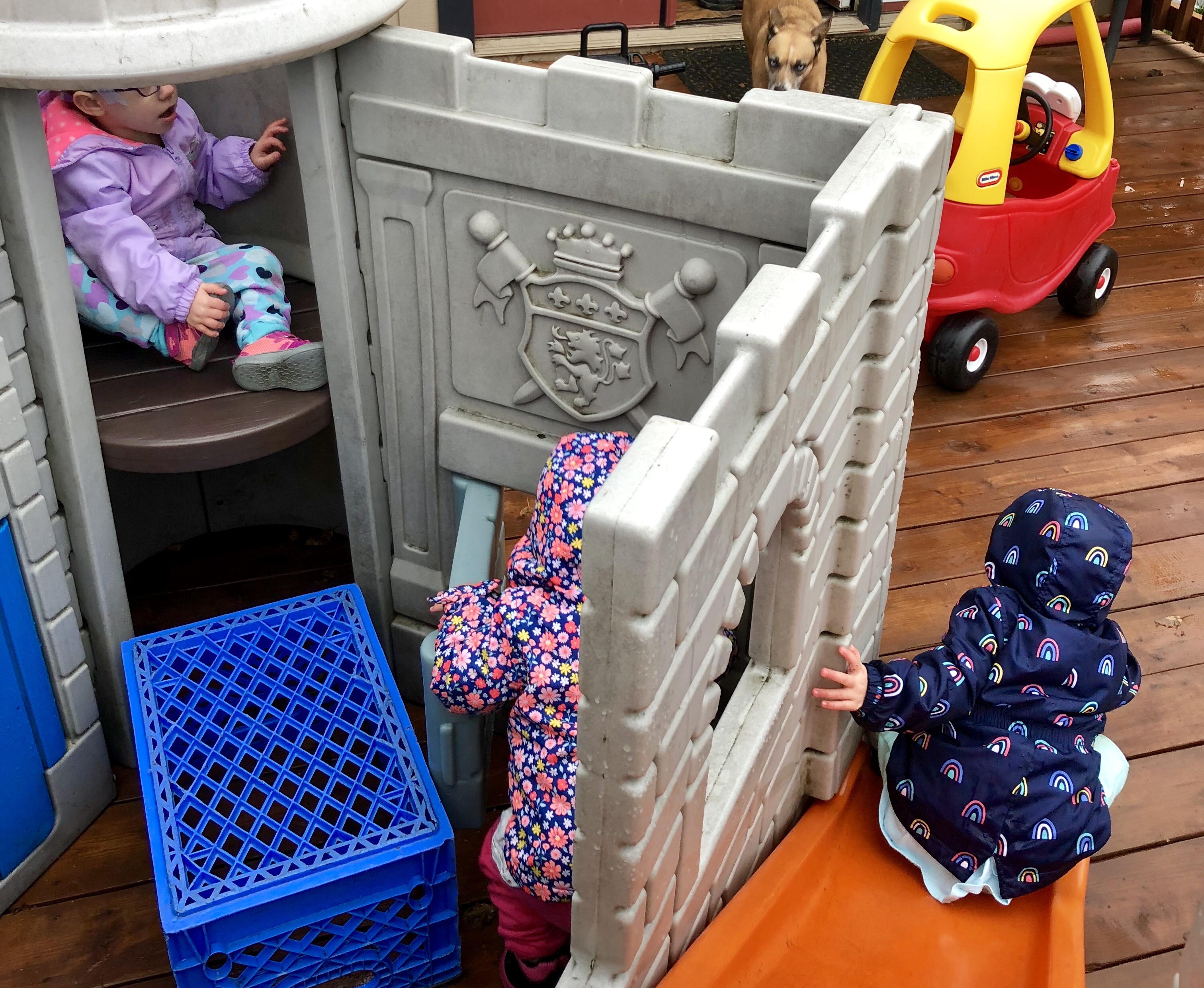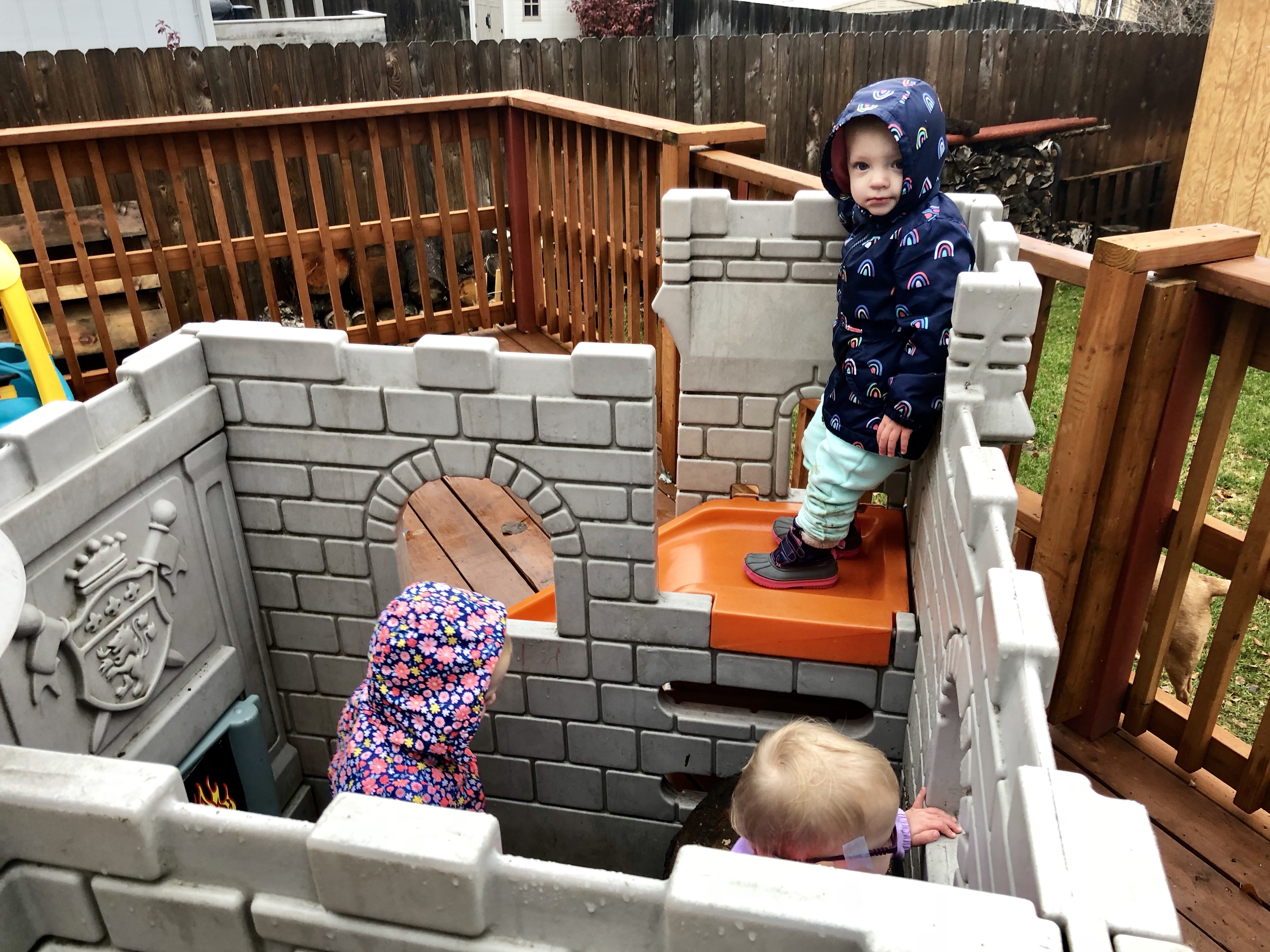 After an unusually successful nap time at home, we bundled up and played on the back porch for a bit while Grandma continued cooking. No one was too thrilled at the wet and windy surroundings, but they all played a bit on the castle (with all the new pieces installed!). It only took moments for everyone to figure out how to climb into the tower and open the fancy trap door. Emerie really liked hanging out in the tower and going up and down, and Harper and Reagan checked it out and then went back to their play cars and the slide.