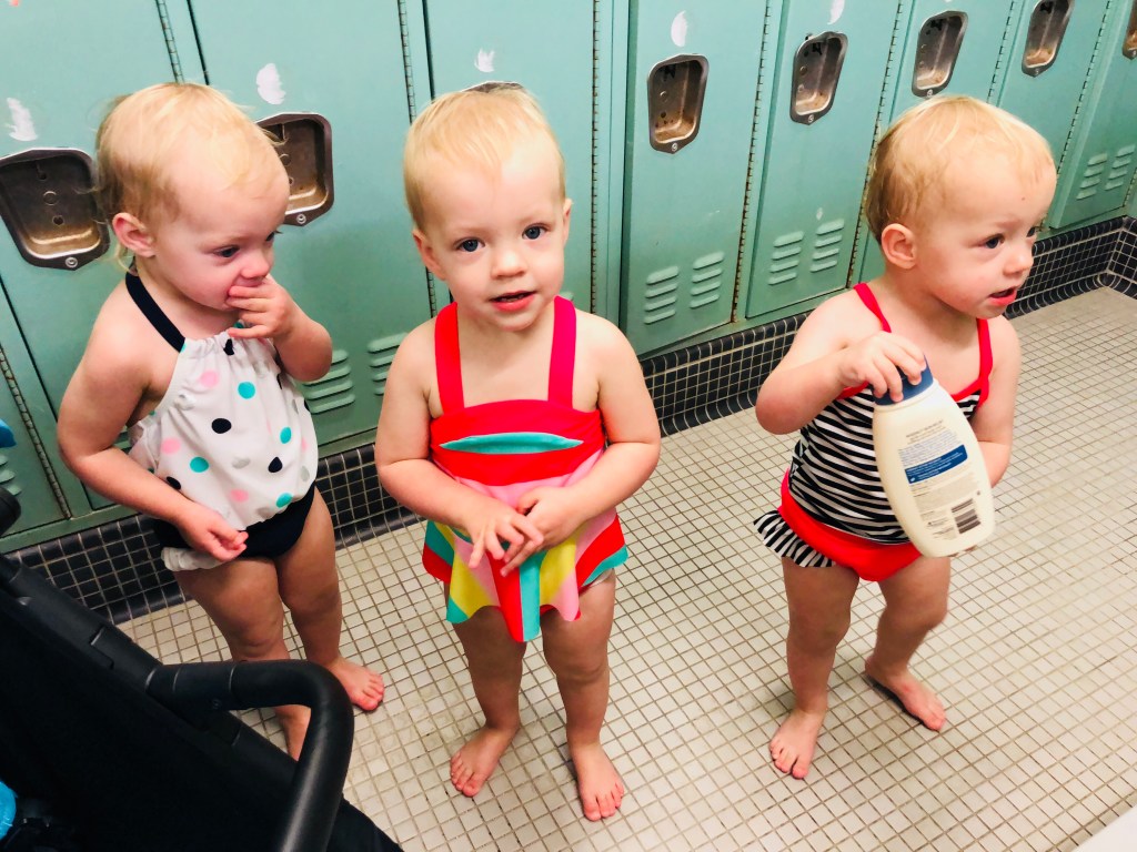 One key piece of advice that was shared to me sometime last winter. Do NOT dress the girls in matching swimsuits. At first I really questioned that, but if you think about it. Having all three looking the same can confuse the lifeguards, they may see a kiddo struggling for a moment, look away for a second and look back to see the kiddo playing fine in the water, while the first one could actually still be struggling and in danger. The lifeguard wouldn’t know that they are two or three different kids when dressed alike and a short distance away. It is very smart to remember this when you have similar sized (and looking) babies in an environment that needs lots of parental supervision and a great piece of advice that I’m taking going forward.
