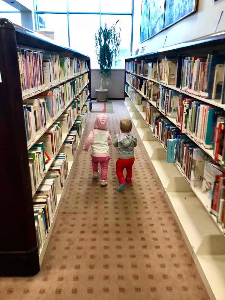 I like to take the girls to the library on my off day- they are usually pretty good about running around the play area and not immediately trying to escape. But after about 10 minutes there this week, they were already off and trying to escape to explore the whole kid area. We ended up letting them check out the book aisles (that burns energy!) and try out the games on the kid computer and the chalk table. Unfortunately they still want to just eat the chalk, not so much color with it. They definitely enjoyed the computer keyboard and mouse, not so much what was playing on the screen.