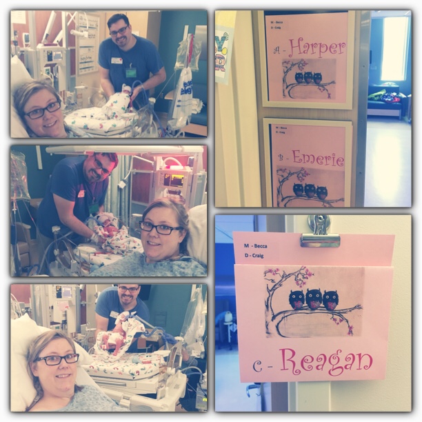 We joked much of the pregnancy that if a fourth baby was hiding out in there, Dr. Richey would be taking them home, unless it was a boy, then they’d get A, B, or C. Luckily, she had correctly counted three girls all along. Baby A, Harper Anne, was officially born at 4:58 PM, with Baby B, Emerie Faye, about 30 seconds behind her, and Baby C, Reagan Jean, at 4:59. No one officially received a name until we saw them in the NICU; and it turned out pretty great that the order spelled out “HER”. That was not pre-planned!