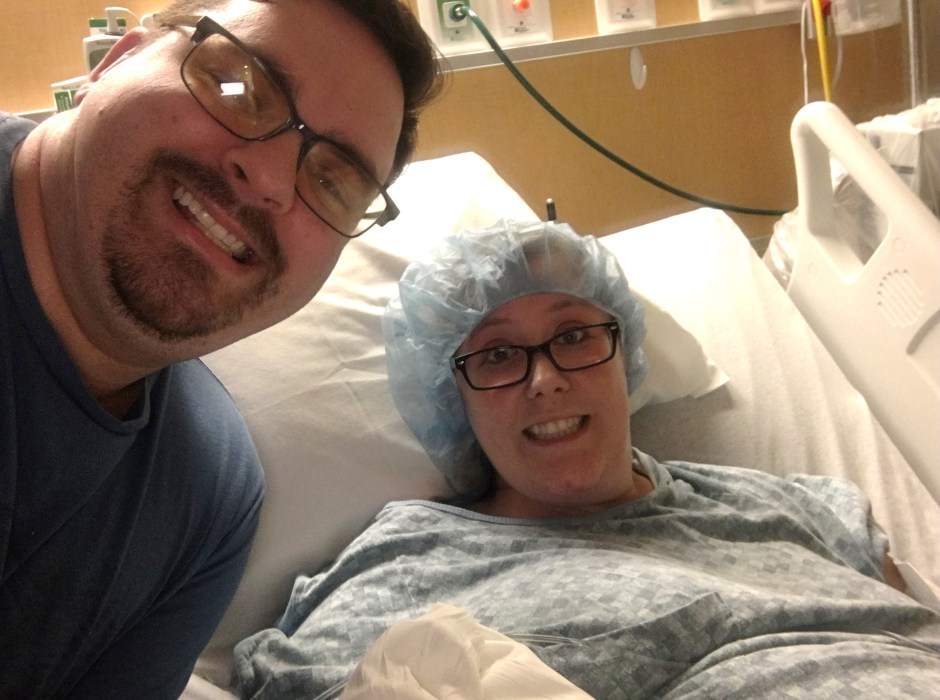 It was quite the party! It really surprised me how quickly that time passed. In total, I was only in the operating room for maybe an hour, and I walked myself in there and sat down on the operating table for the spinal block. It wasn’t as bad as I expected and felt like a warm rush of water drifted down my legs. Before I even realized it I was on the table, ready for go-time. Simultaneously, Craig was out in the pre-op area getting on his gown so he could come in.