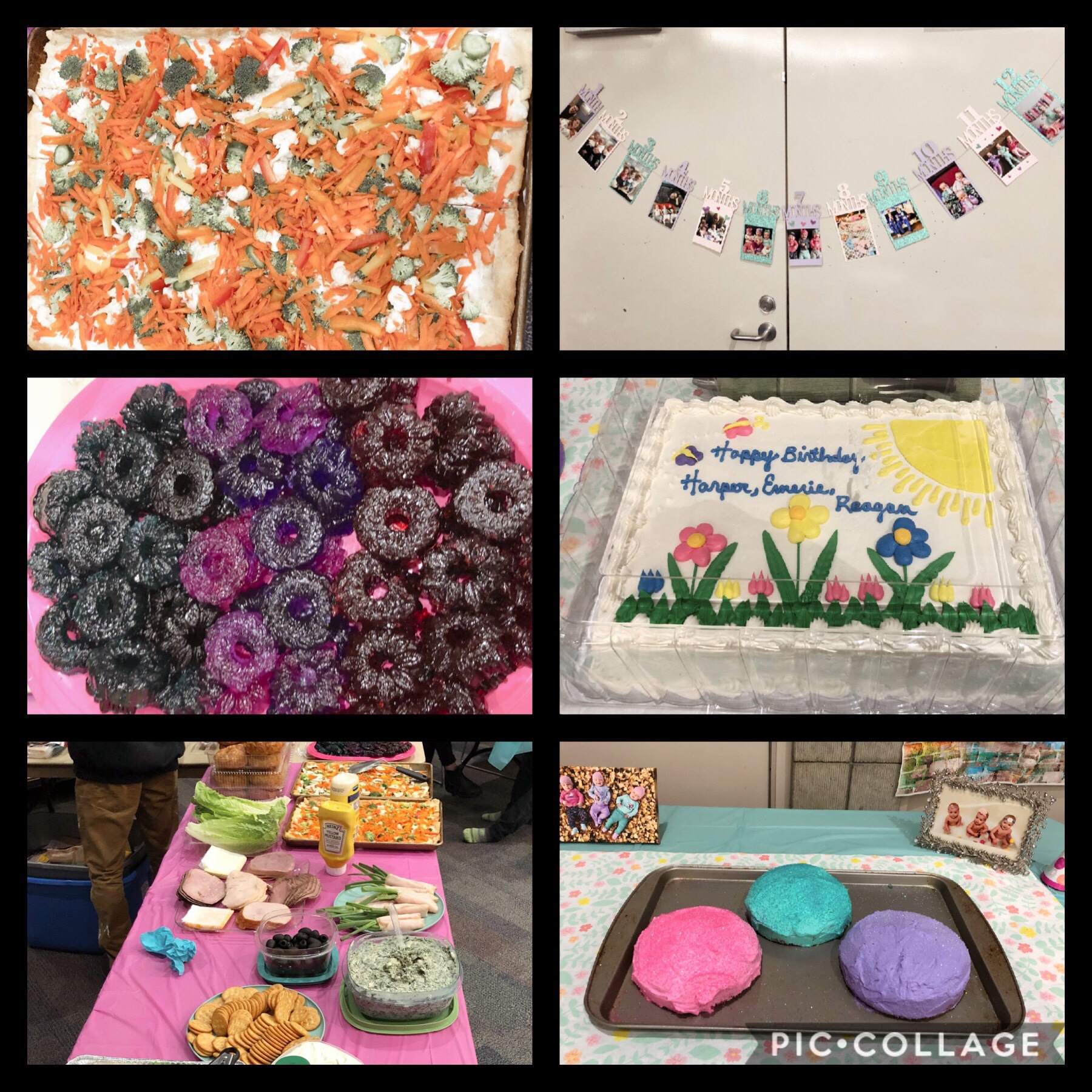 We decided to make our own smash cakes and food trays for the party. Grandma Sue created fancy vegetable pizzas, veggie platters, and her delicious spinach dip; William created flower jello molds in the girls’ colors, and we bought all the fixings for sandwiches. Family arrived from out of town and out of state to celebrate with us, as well as a bunch of friends!