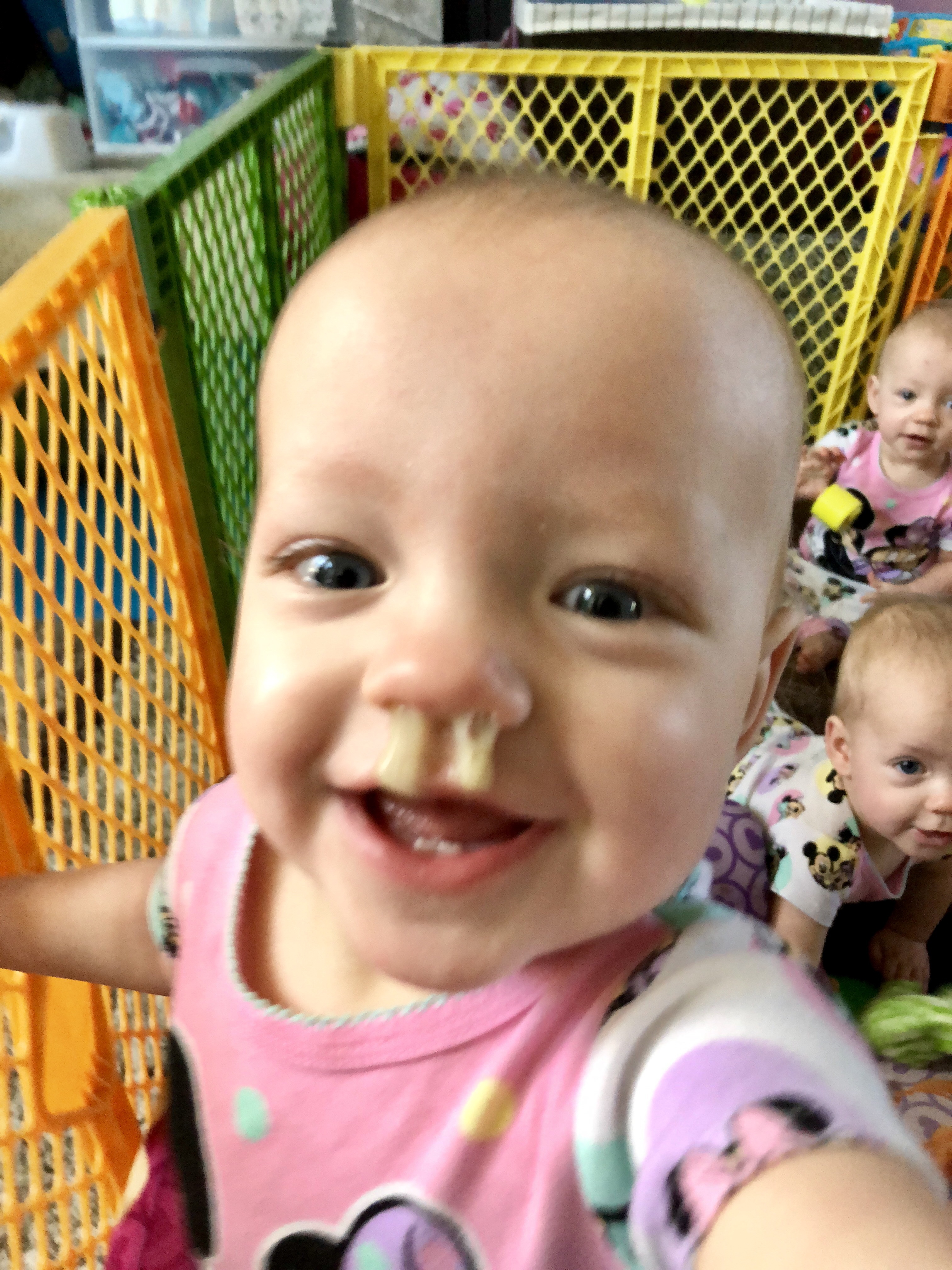 As we increase food intake we are finding that they still want a decent amount of milk. In fact, on many occasions they will casually eat food but then insist on a bottle afterwards, especially Harper and Emerie. Reagan is a little less bottle enthusiastic than her sisters but I also think she is distracted by all the fun things she could do instead of eat!