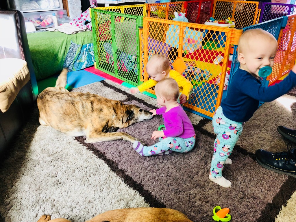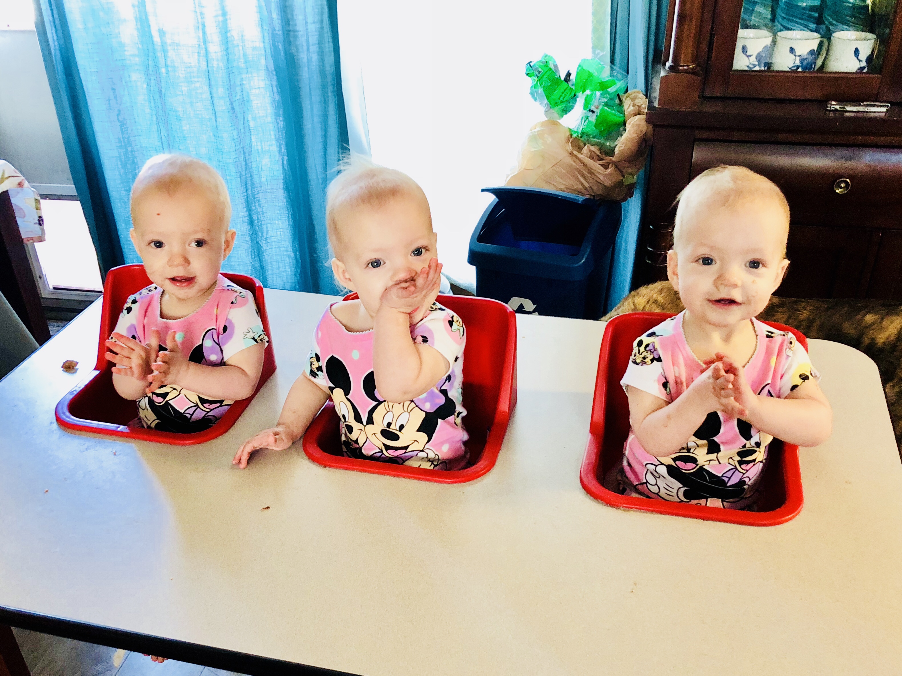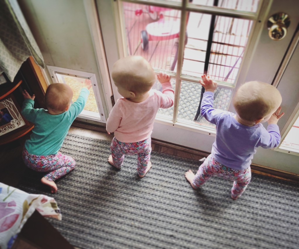 Remember when everyone’s first love was the ceiling fan? This discovery was about a year ago and lasted far into 2018. The fan is now replaced with window/door curtains. This past weekend we opened up the living room, taking part of the baby prison wall for a few minutes each afternoon so they could all wander. This was quite the hit and the curtains were discovered to be amazing. Everyone played in the dog water bowl (before we put it outside), and enjoy standing at the back door, balking at the dogs and playing peek-a-boo with the curtains. The kitchen is also fair game. For the moment we are enjoying they do not understand how to open the cabinet doors.