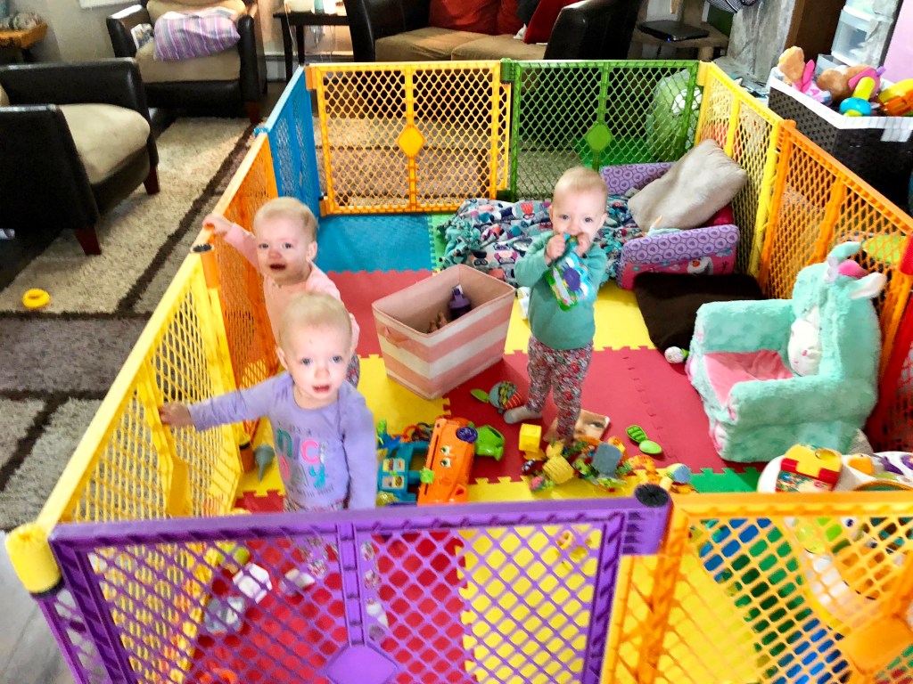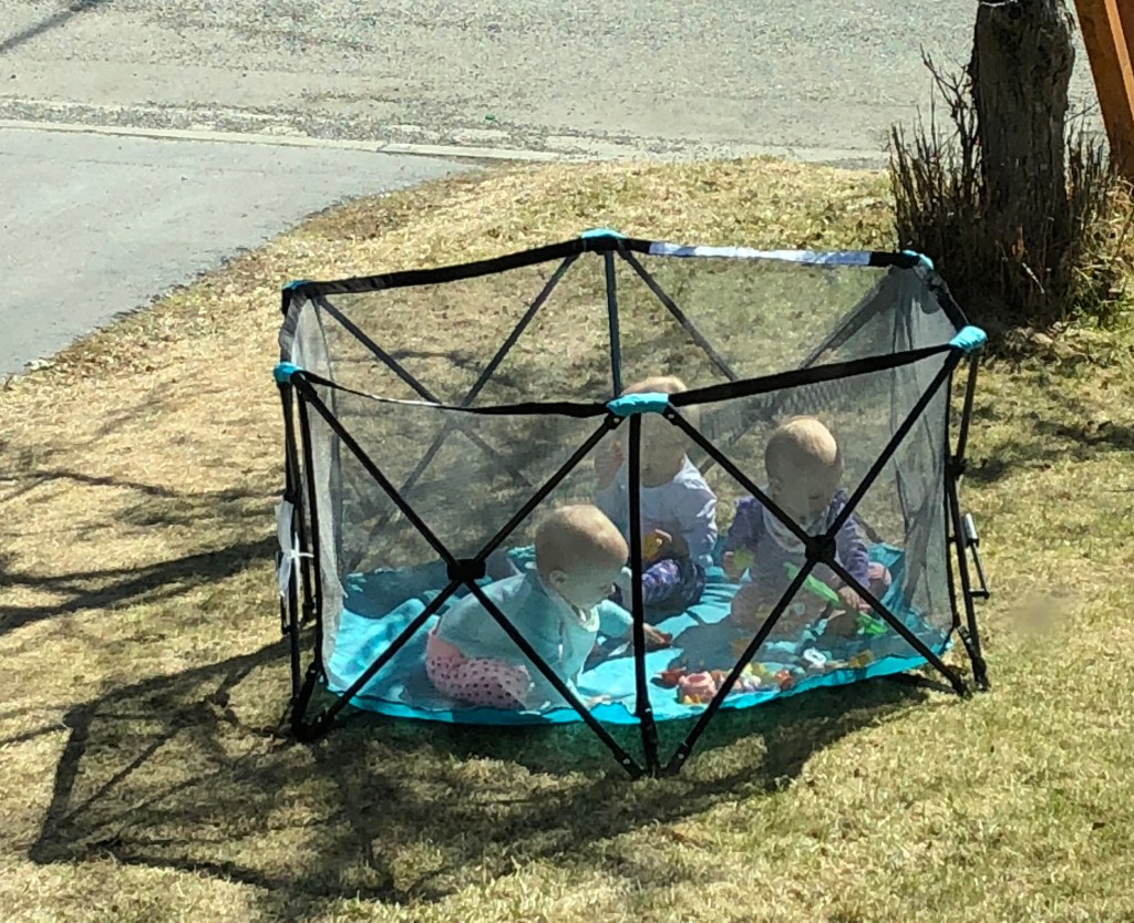 A few other fun new things include Harper raspberrying my leg (and thinking it was hilarious), Emerie gaining great coordination with moveable toys and doing things on her own, and Reagan is a speed crawler! Everyone enjoyed the gorgeous sun this weekend and we set up the new Regalo playpen. It’s light and useful at both the park and in the front yard as we start spring cleaning the garage. I also figured out it folds up perfectly to fit across the stroller bars so I can single handedly bring it with me somewhere and let the girls out to play.