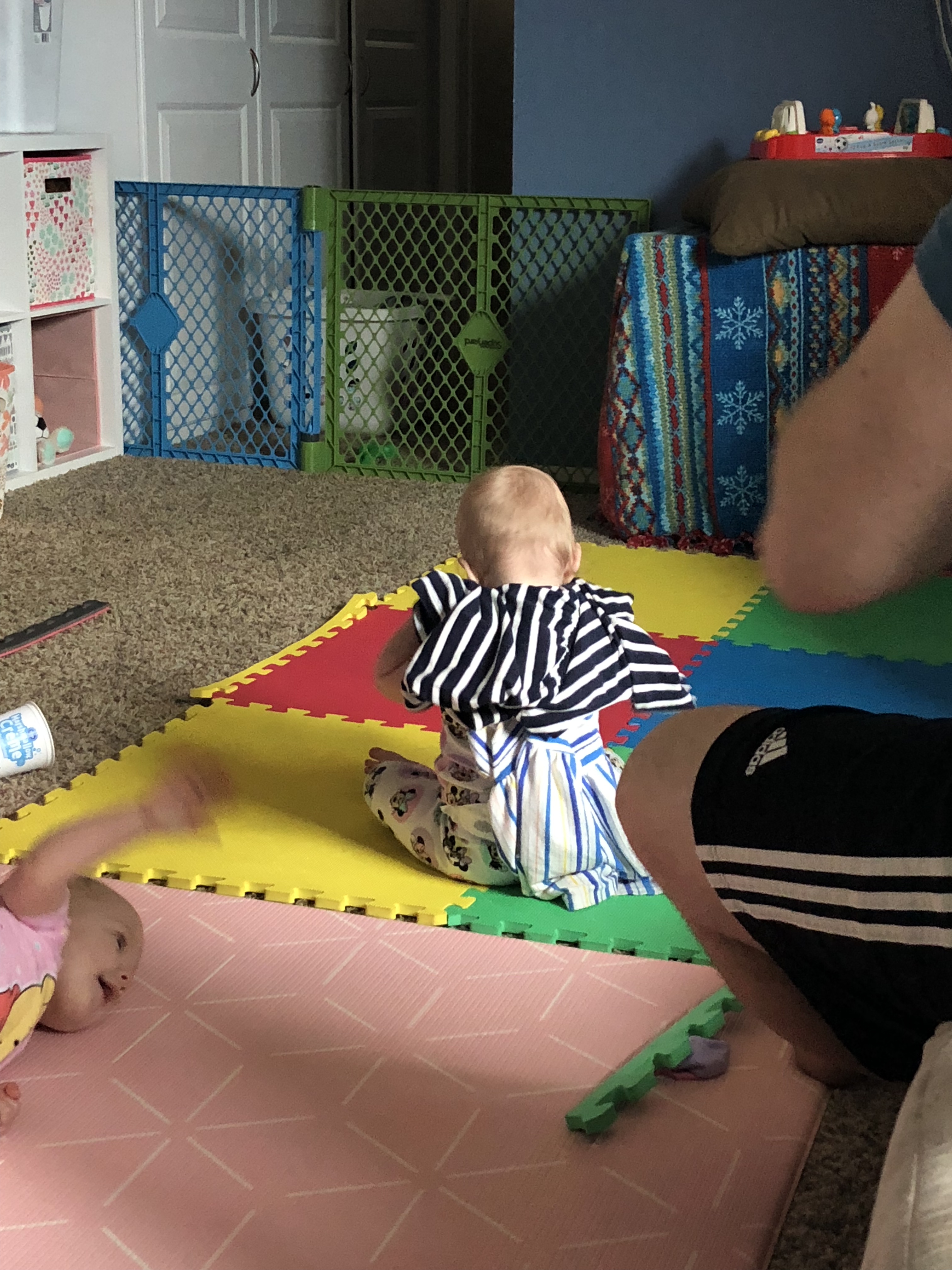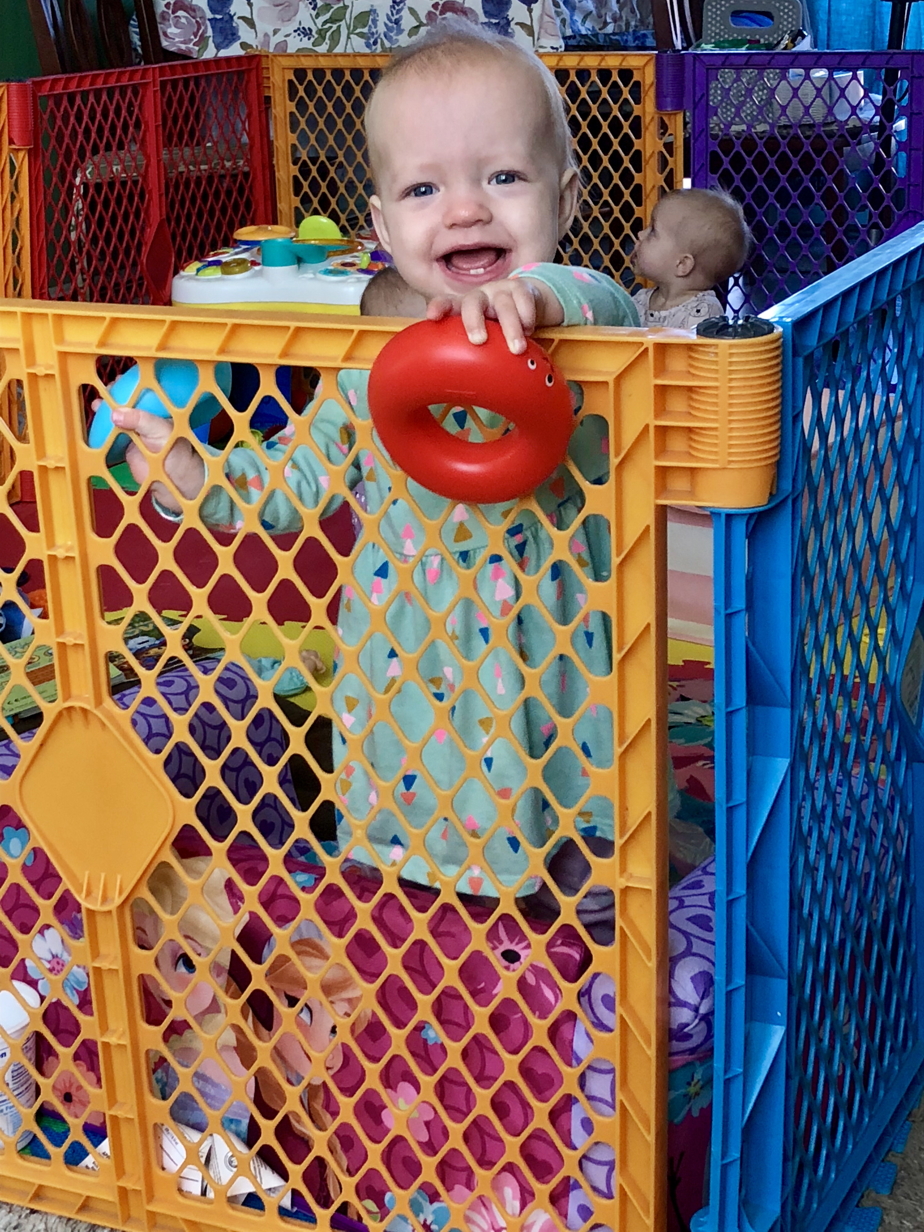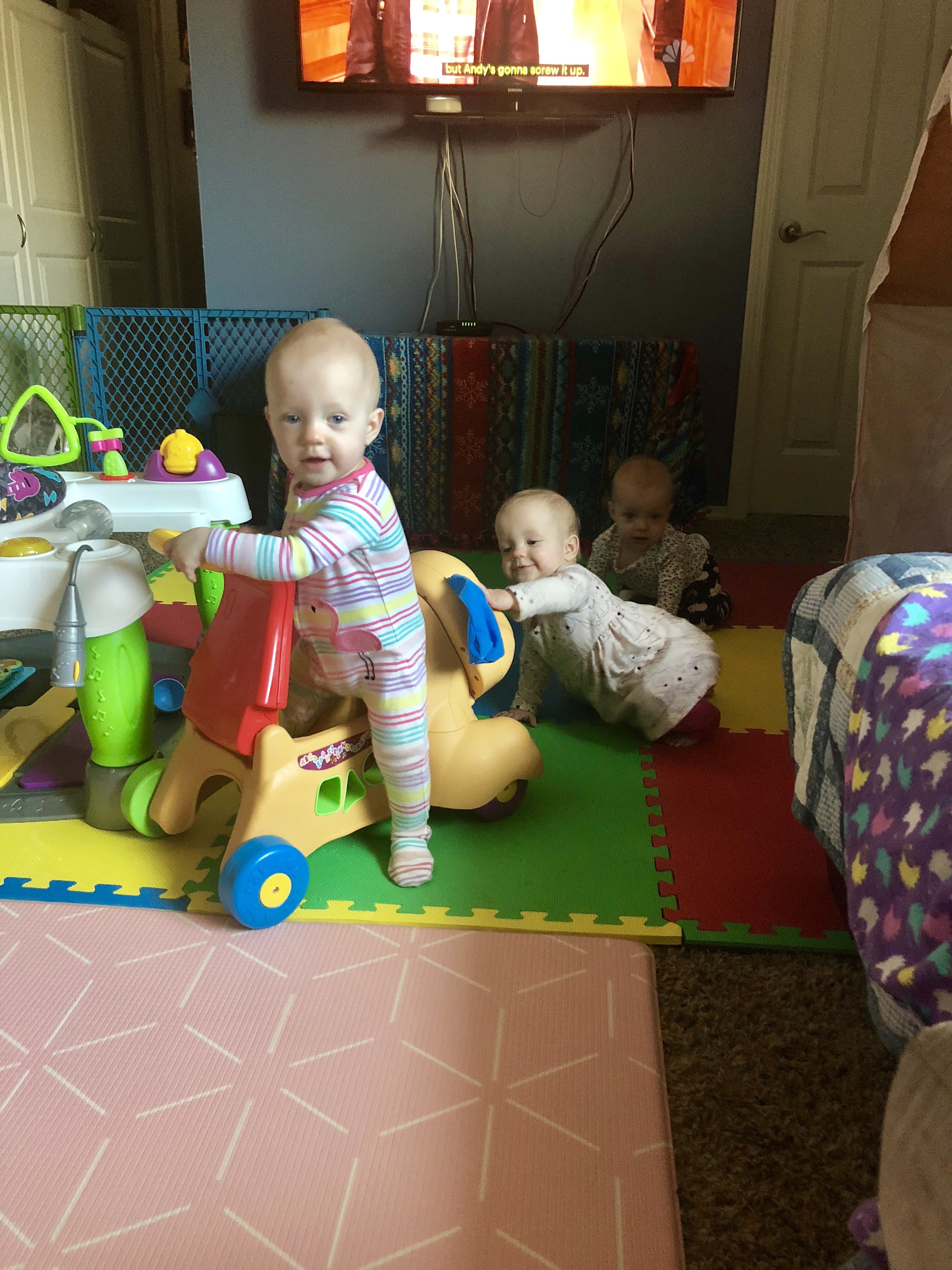 The jumpers are still used, but not nearly as much. Floor playtime is the new jumper! We keep rearranging the house to fit everything now that everyone is mobile.