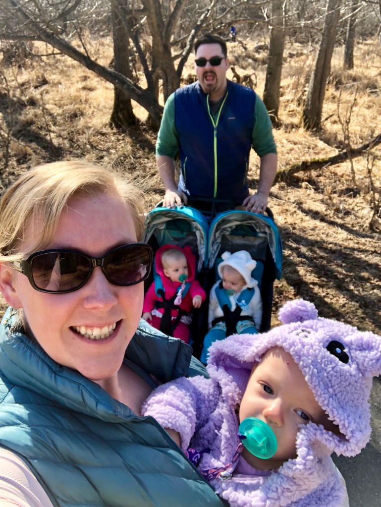 We also went to the elementary school park down the street and our twin/triplet outing overtook the play equipment! It is definitely a bit of chaos (and added anxiety!) when you have multiples. The girls certainly polished off some playground rocks before we pried them out of their mouths. Everyone enjoyed the swings and the sunshine.