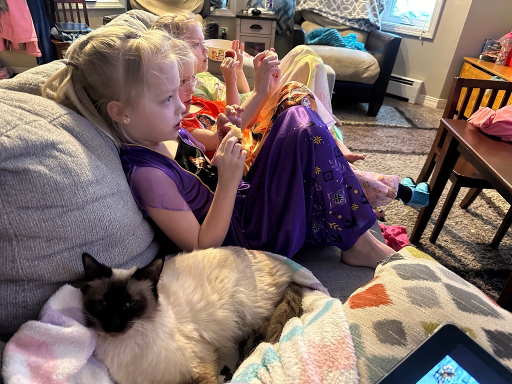 The girls were excited for “real” eyeshadow and my eyeliner, and did pretty well to not smear it everywhere. Harper ripped her tights after the first dance and although displeased, thankfully didn’t throw a fit over it. Also unlike last year, Craig didn’t have to carry a screaming, overtired toddler to the car; all three did great after the picture with their teachers and some much needed French fries; bedtime routine was smooth sailing after a long night.