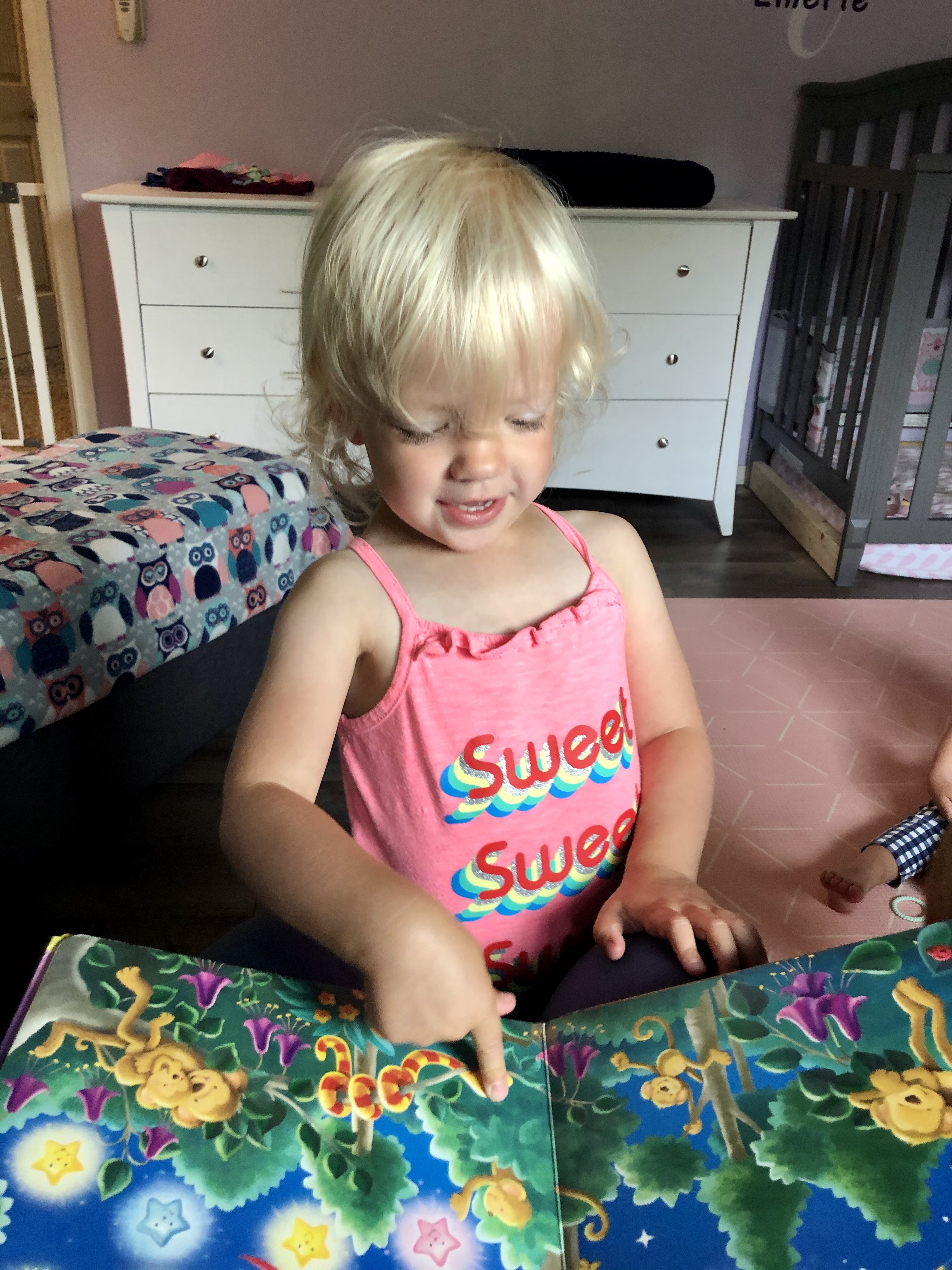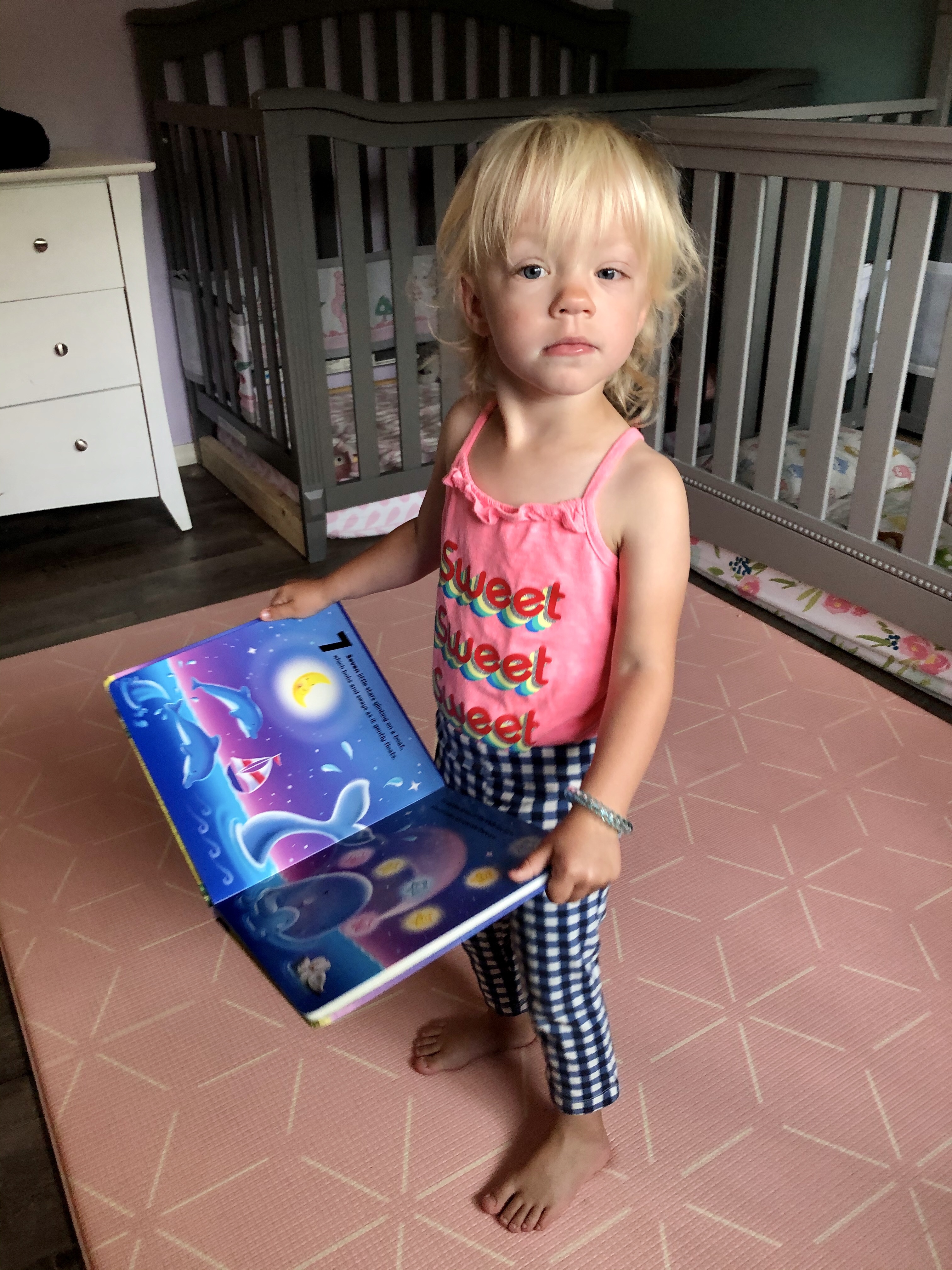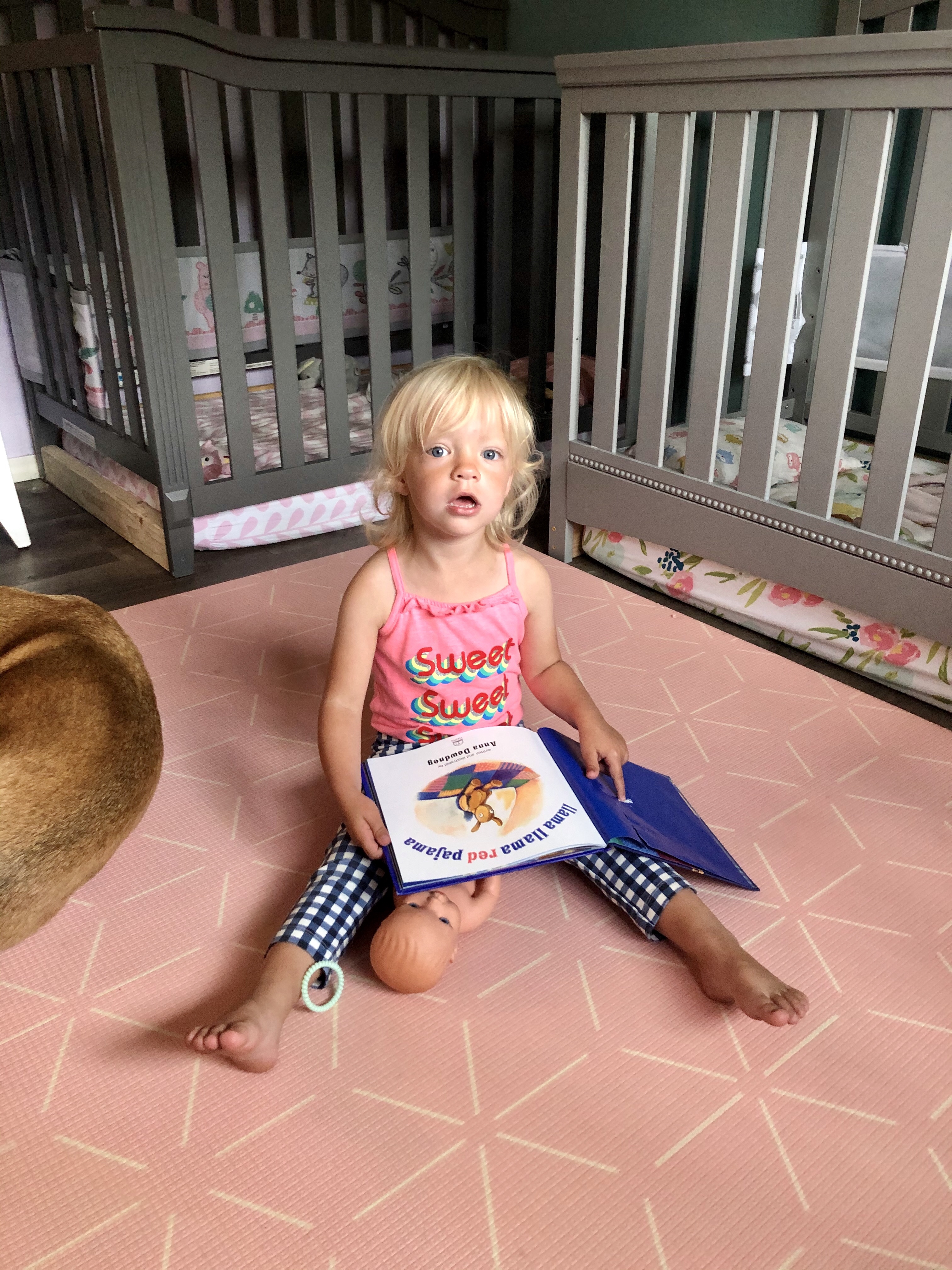 Books – the other day Harper took it upon herself to read the night-night book to her half awake sisters, as we started the morning. She sat on the toy ottoman with the book in her lap and essentially sang twinkle twinkle little star (sounds like inkle inkle ittle star and is super cute) while holding up the bedtime star book.