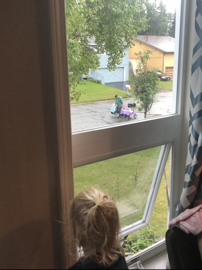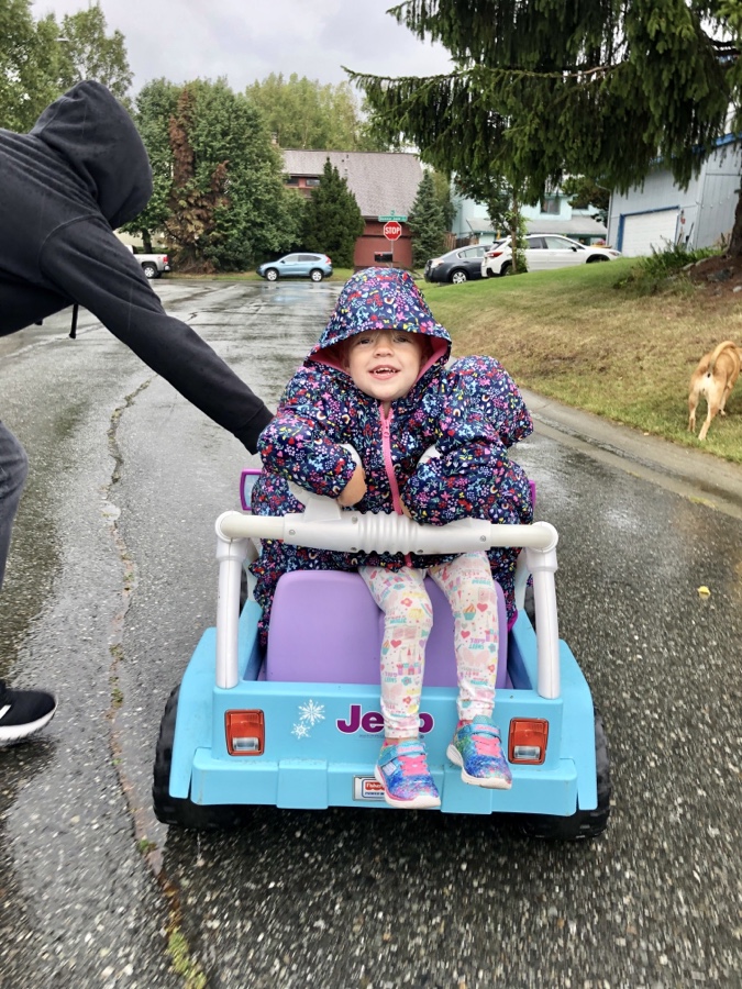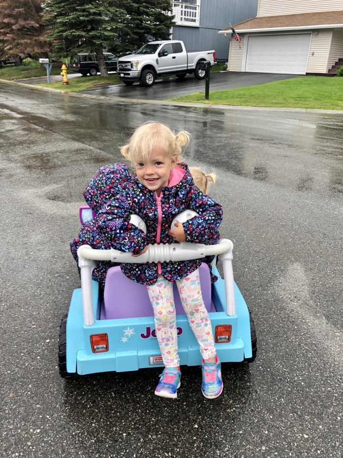 One funny story out of this week. The girls “drove” a friend’s powerwheel truck at a park date last weekend and had a great time (other than the constant fighting over it). The truck was wide enough for three across and move on the pavement, inspiring us to do a little local, online shopping and find used ones to enjoy. We drove around the neighborhood the first night with all three crammed on and visited with a neighbor who has a similar vehicle. The second night we went down our street, in the rain, hoping for a few happy minutes as we transitioned from daycare to home. As you can imagine, using two vehicles when you have three toddlers doesn’t always go as smoothly as one would like. The three photos below say it all, some real life right here…it started out with smiles and giggles down the street, stretched into fighting over whose foot was on each gas pedal or wanting to be anywhere but where they were sitting at that moment, and ended with three total meltdowns in the middle of the street, both cars left on a neighbor’s front lawn, said meltdowners carried screaming down the street into the house (once we caught up with the little marathoners), and Craig retrieving the vehicles and carrying them home in the rain while I worked to calm the masses in the living room. True story, folks. You can’t make these things up.