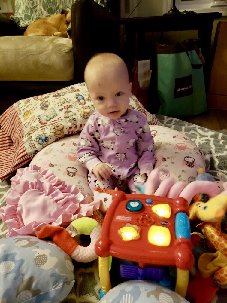 Development: Em loves her toes and constantly pulls off those pesky socks covering them. She is greatly improving on sitting up, and her head shape has improved dramatically from her six month update. She enjoys yelling “dadadadadada” constantly and in numerous octives.