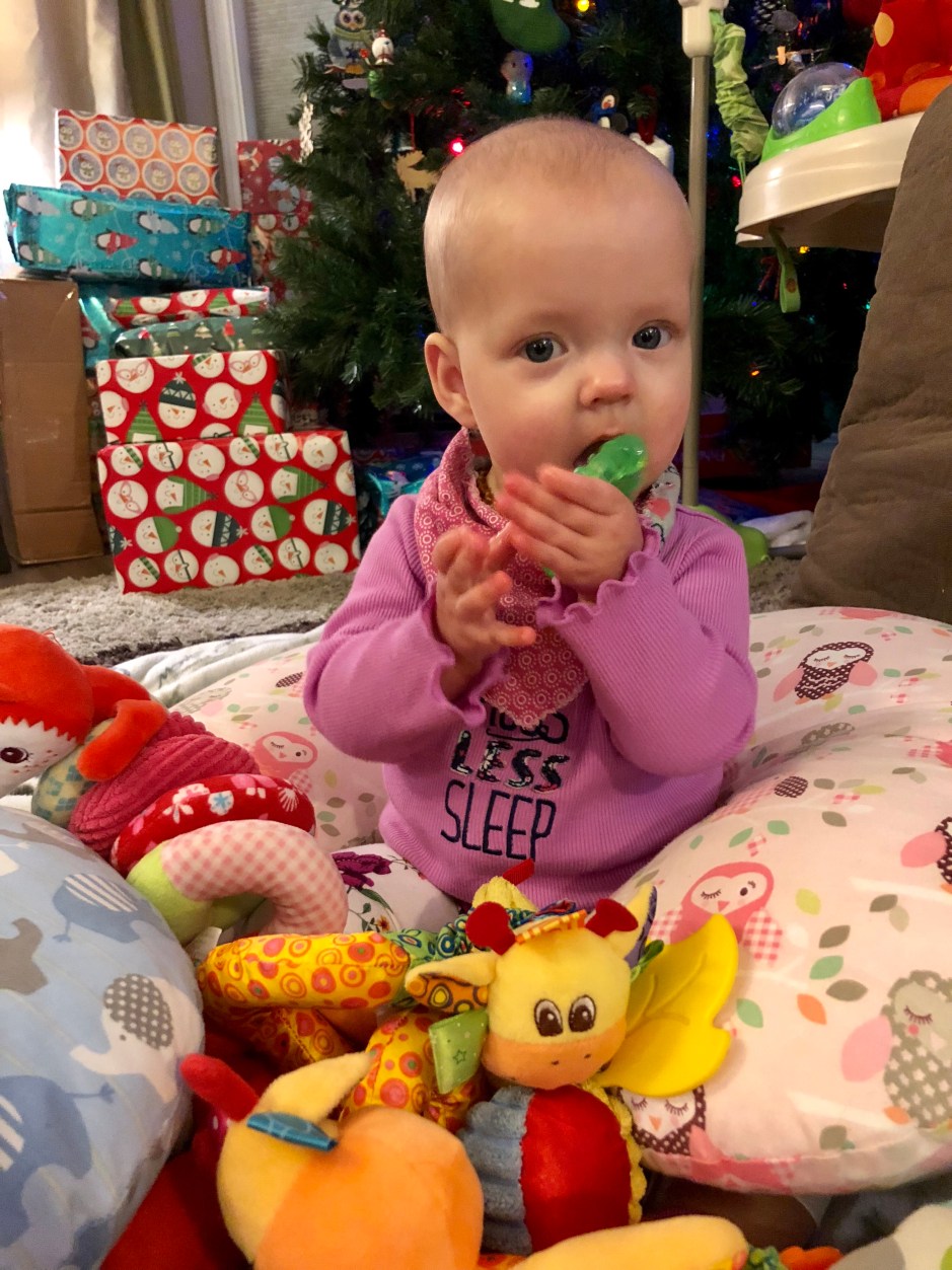 Likes: Toys. Reagan is definitely the toy hoarder. She tries to gather all toys near her into her lap; it does not matter if Harper or Emerie are chewing on said toys, they will be hers… She especially likes toys that sing and light up, and her singing toucan! Reagan also took to the frozen teethers the fastest. Lastly, she has a happy shriek sound that is the sweetest thing!