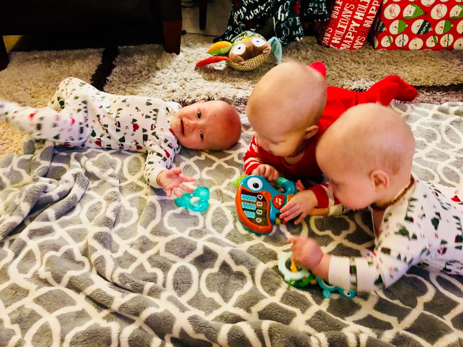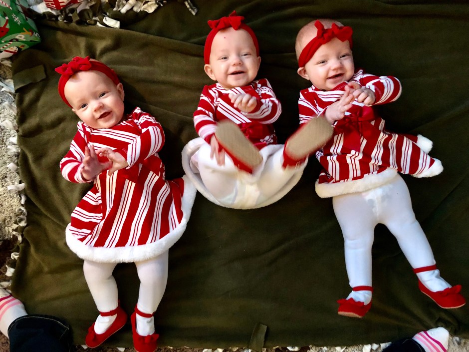 All three girls reach out for Mom and Dad now as well as for their bottles. We still receive big smiles in the morning, although lately those come from the rock-and-plays instead of the cribs!