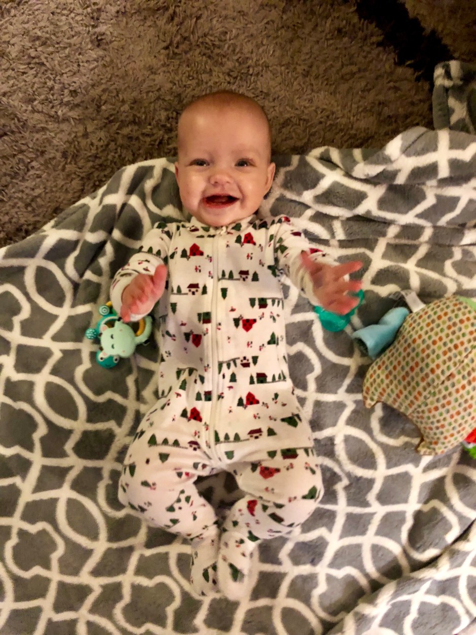Dislikes: She is not the biggest fan of baby food most days and generally prefers her bottle. She is also not a fan of teething or tummy time…other than that, she is still our chillest baby most of the time. Like her Grandma Anne, she also seems to run a little cooler than her sisters and often has cold hands and feet.