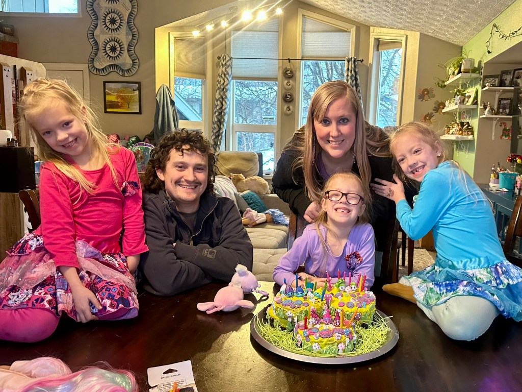 I also must mention the girls’ excitement to see if Craig won any ribbons, for his first time entering the arts portion of the fair. He knitted two shawls and rainbow socks, and I am personally offended he didn’t instantly win first place on all three entries! The girls were happy to see his 3rd place ribbon; it was quite sweet. I enjoy having an artsy husband, who really does have quite the talent and inability to sit still without creating something.
