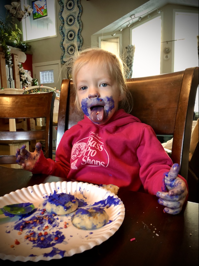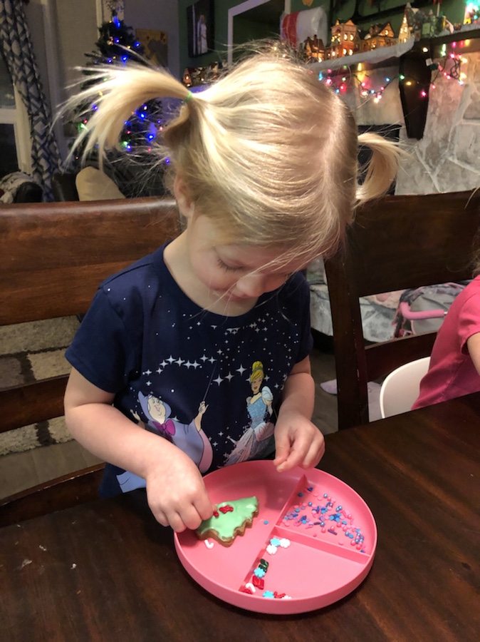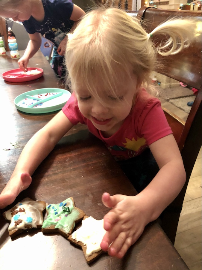 I expected Harper to excel at this the most, given her love of coloring and ornament decorating, but Reagan ended up really loving the craft. Harper decorated and was happy to accept additional cookies to do…like a machine, always speeding through! Emerie pretty much sat there and sampled one sprinkle at a time until the plate was mostly empty, then started licking the frosting off the cookies. Reagan concentrated and wanted to perfect her two star cookies- she insisted mommy not finished anytime I tried to add more. It took a few days before anyone trusted that the cookies were edible but eventually they started snacking on them and not just licking off the frosting.